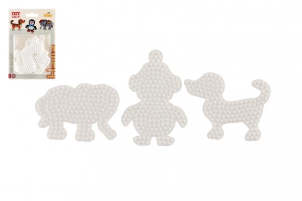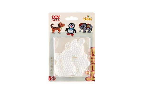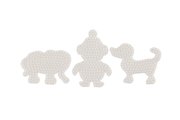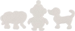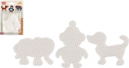 Hama lyginamų karoliukų pagrindų rinkinys leidžia vaikams nuo 5 metų kurti spalvingus paveikslėlius naudojant baltus plastikinius pagrindus dramblio, pingvino ir šuniuko formų.