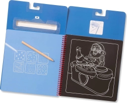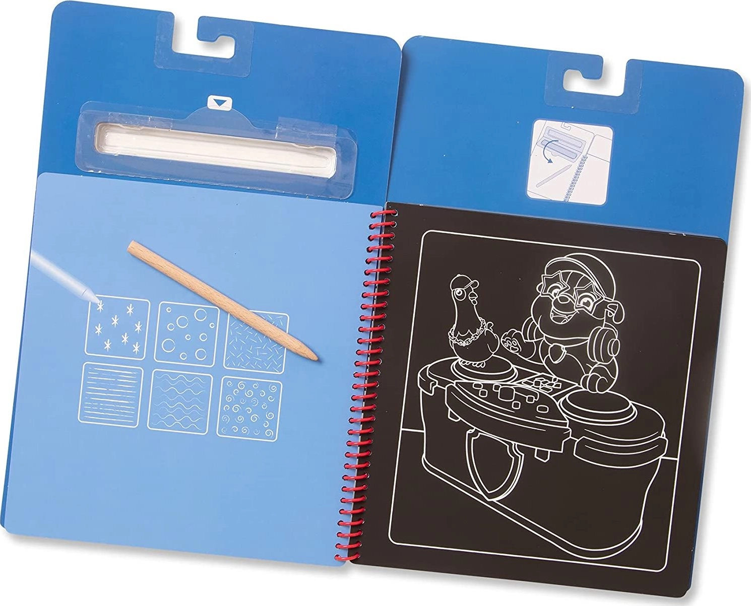 Tereikia paimti pridėtą medinį graverį, švelniai nubraukti juodą sluoksnį ir po juo pasirodys ryškiaspalviai piešiniai. Pridėti šablonai ir lipdukai padės vaikams kurti savus motyvus, lavinti smulkiąją motoriką, kūrybiškumą ir kantrybę.