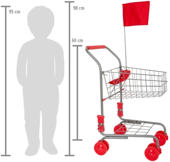 Sidabrinis vaikiškas pirkinių vežimėlis SMALL FOOT su realistišku dizainu išsiskiria stabiliu metaliniu rėmu, raudonais akcentais ir saugos vėliavėle. Dėl pasukamų priekinių ratukų vežimėlį lengva valdyti net mažesnėse erdvėse, tad vaikai gali patogiai „apsipirkti“ kaip tėvai.