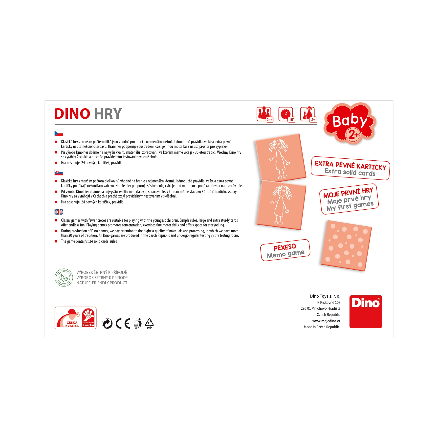 Pexeso kūrime dalyvauja pripažinti čekų dailininkai ir grafikai, kurie rūpinasi kokybe ir kūrybiškumu. „Dino Toys“ garantuoja čekų kokybę ir ilgametes tradicijas žaidimų bei žaislų srityje.