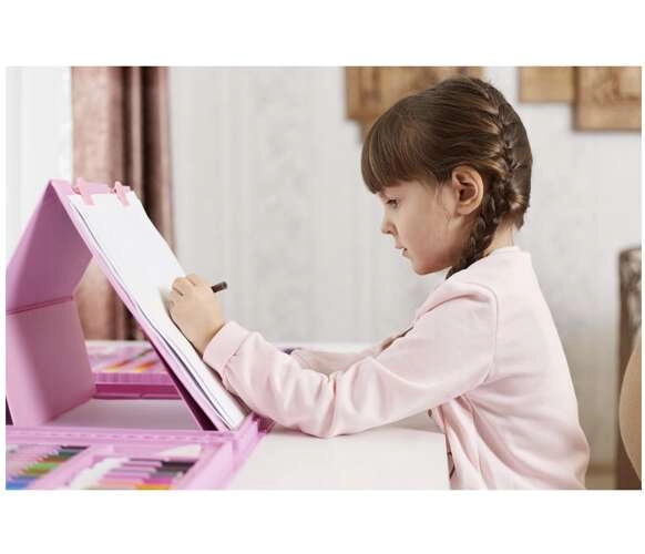 Rinkinyje taip pat yra specialios dėtuvės greitai prieigai prie atskirų įrankių, kas leidžia išlaikyti tvarką ir apsaugoti visas dalis. Be to, lagaminą lengva nešiotis dėl paprasto naudojimo ir tvirto užsegimo su lipniomis juostomis. Tinka naudoti mokykloje, namuose ir kelionėse.