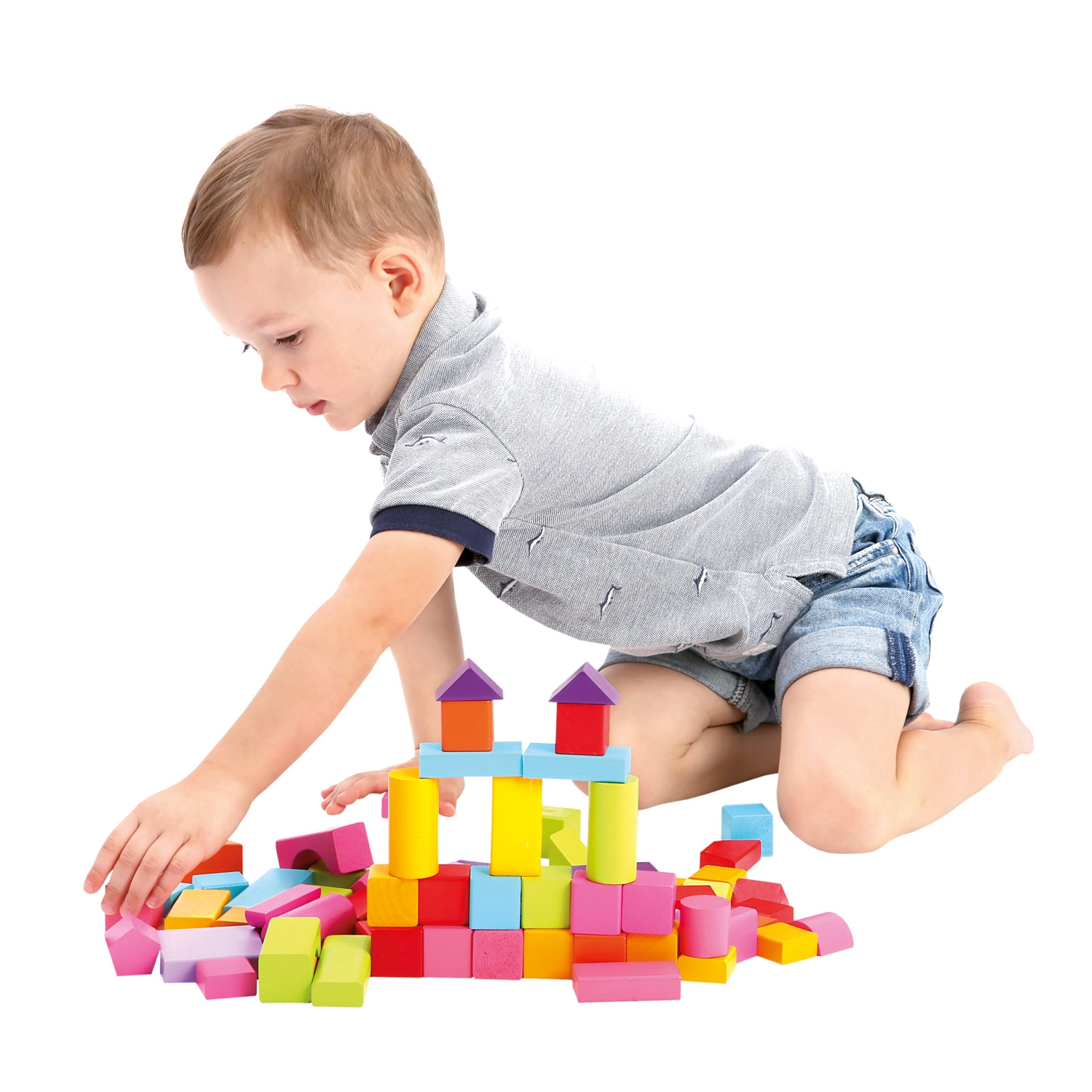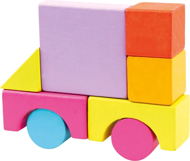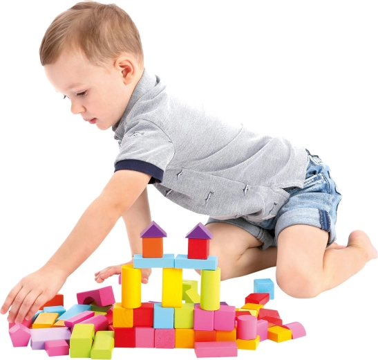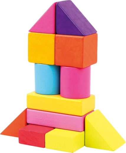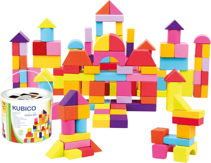 Rinkinyje rasite įvairių formų kaladėles – kubelius, stačiakampius gretasienius, cilindrus, lankus ir trikampius – ryškių spalvų, kurios skatina kūrybišką ir atvirą žaidimą.
