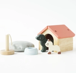 Praturtinkite vaiko fantazijų pasaulį žavingu medinių augintinių rinkiniu – šuniuku ir katyte su būda ir priedais. Šis aukštos kokybės priedas lėlių nameliams ir žaidimų scenoms skatina socialinį žaidimą, komunikaciją ir vaizduotę. Pagaminta iš FSC medienos, ranka papildomai ištapyta netoksiškais, vandens pagrindo dažais ir sukurta taip, kad tarnautų ilgai.