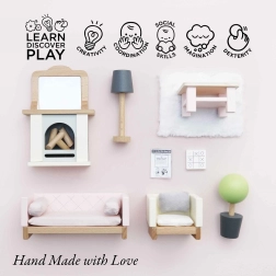 Šis gražus svetainės kambarys idealiai tinka lėlių nameliams ir sukurtas įkvėpti vaikus žaisti bei lavinti jų vaizduotę. Įranga svetainėje dekoruota netoksiškais dažais ir pagaminta iš FSC® sertifikuotos medienos ilgalaikiam smagumui.
