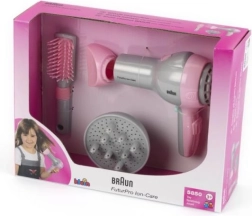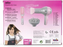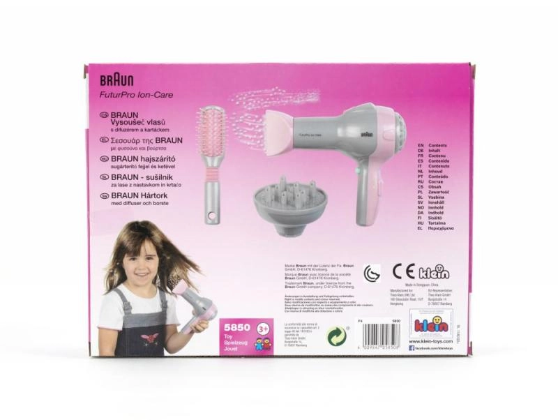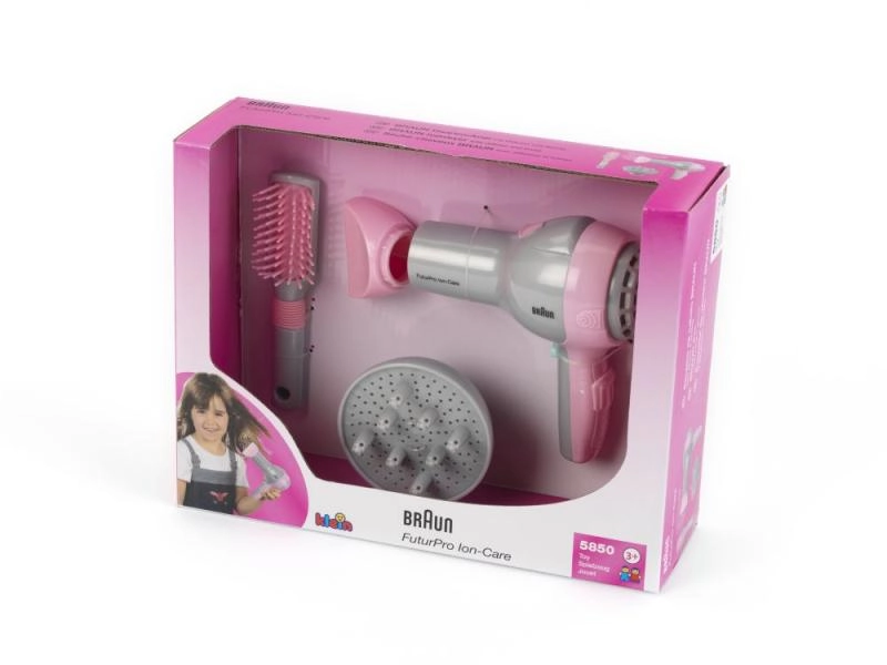 Pristatome vaikišką Braun plaukų džiovintuvą su difuzoriumi ir šepetiu, idealiai tinkantį mažosioms kirpėjoms. Šis produktas pagamintas pagal Braun licenciją, todėl atrodo itin realistiškai, panašiai kaip tikras įrenginys. Gaminys visiškai saugus, džiovintuvas pučia tik orą neįkaisdams, kas užtikrina vaikų rankų saugumą.