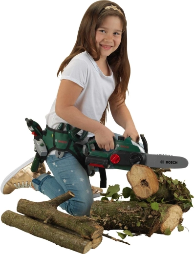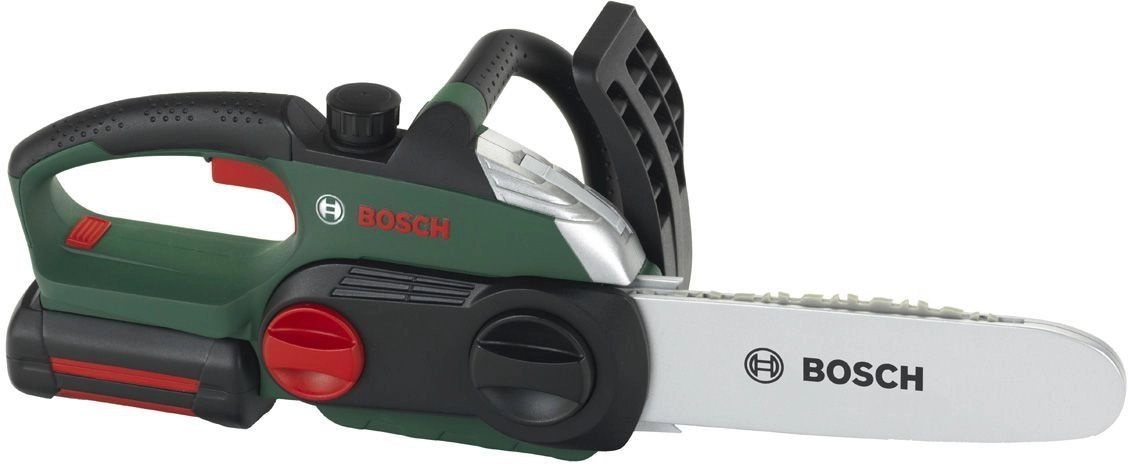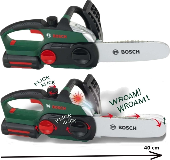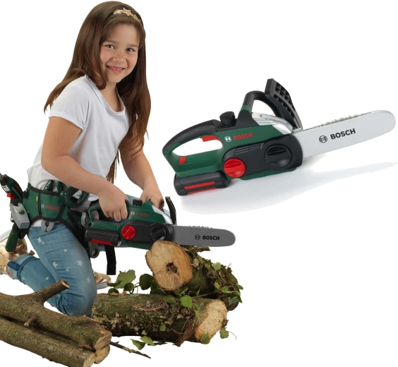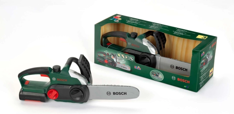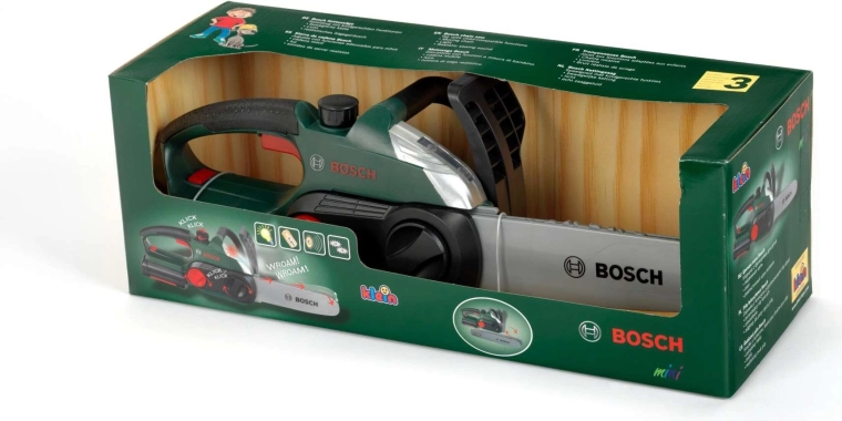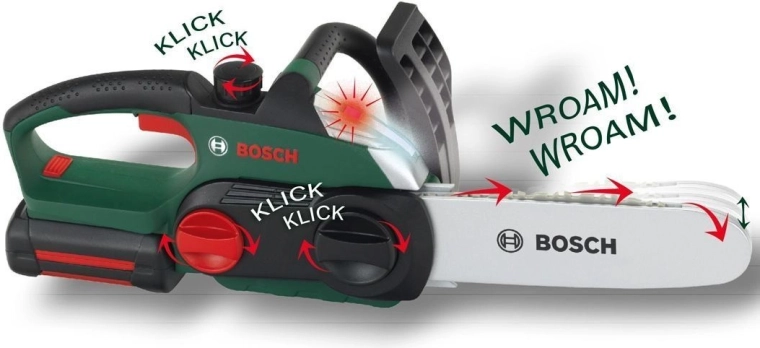 Realistiškas vaikiškas baterijomis maitinamas grandininis pjūklas iš Klein su BOSCH mini licencija pradžiugins mažus meistrus. Jis siūlo judančią „grandinę“, šviesos efektus, veikiančio pjūklo garsą ir ergonomišką rankeną patogiam ir saugiam žaidimui.
