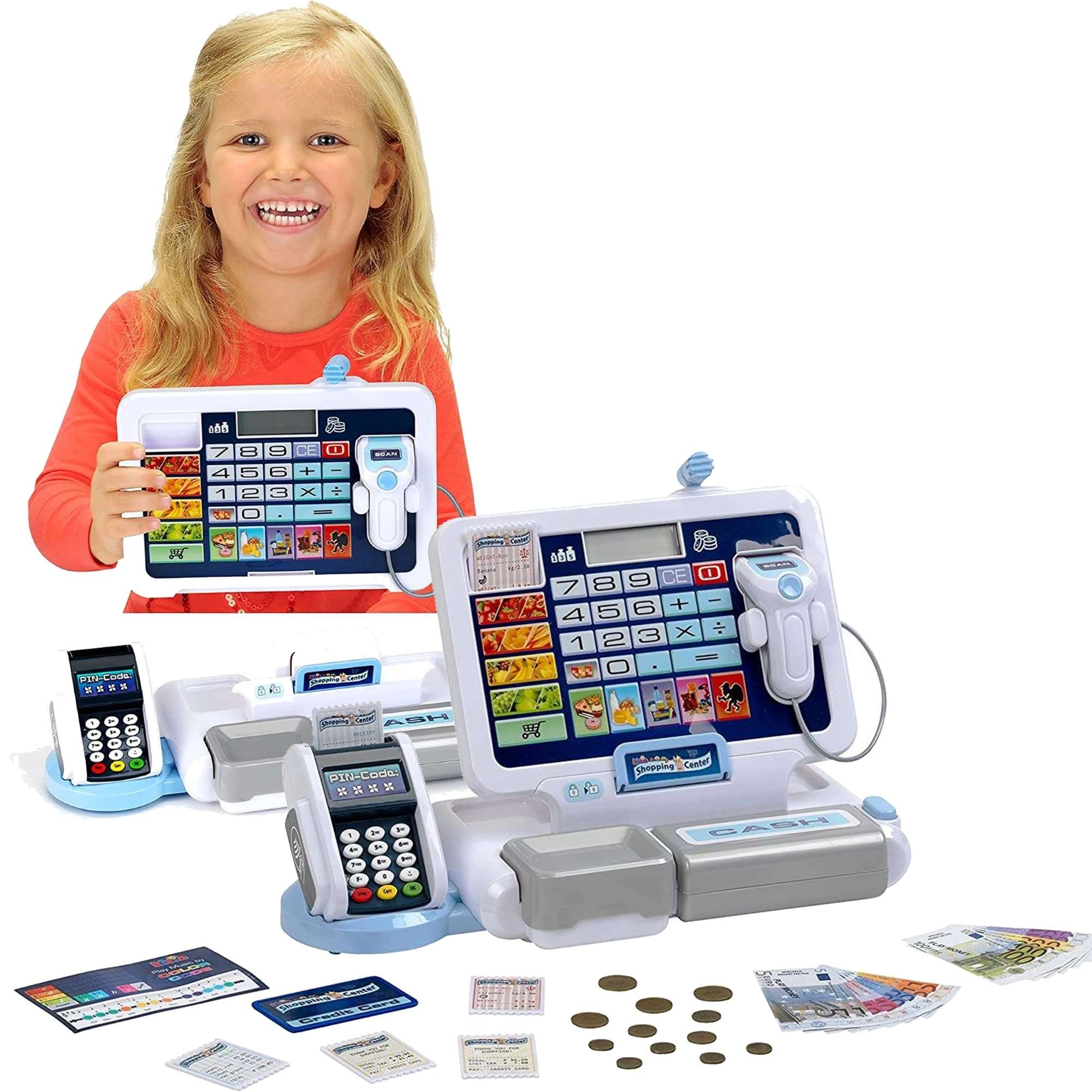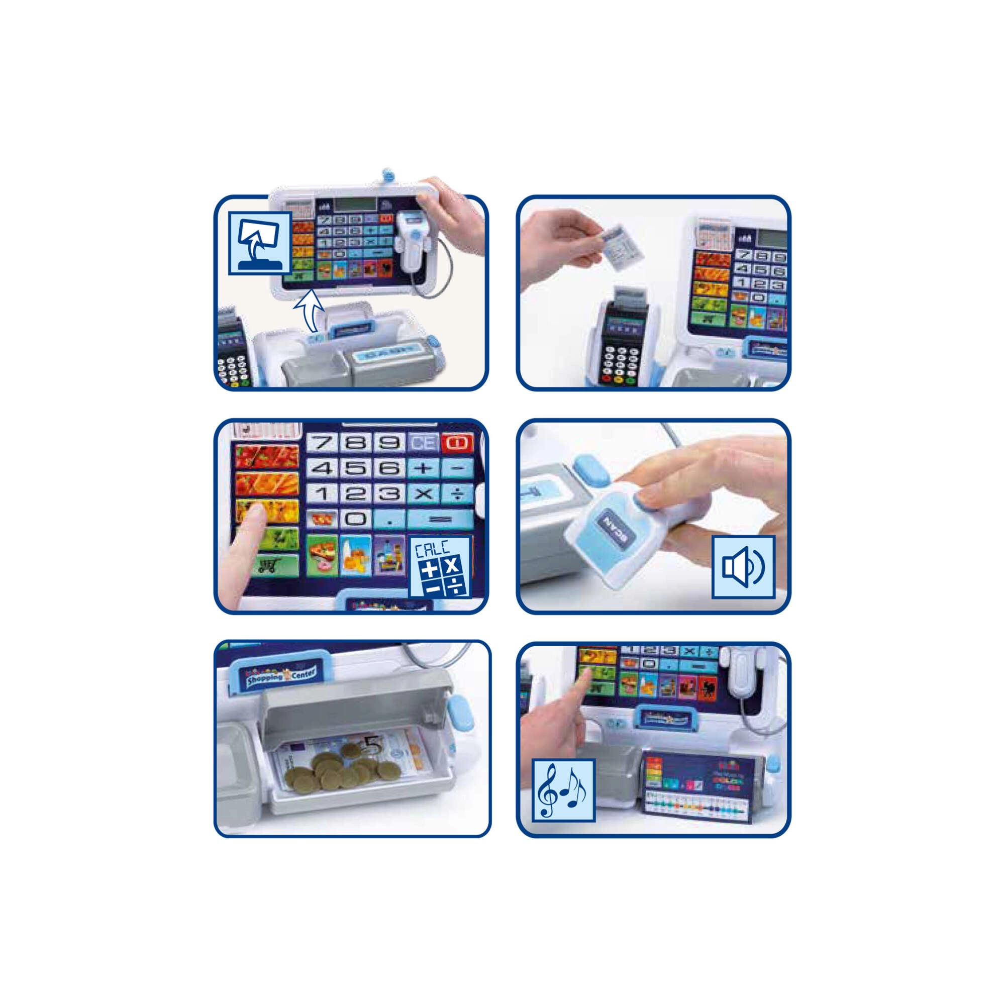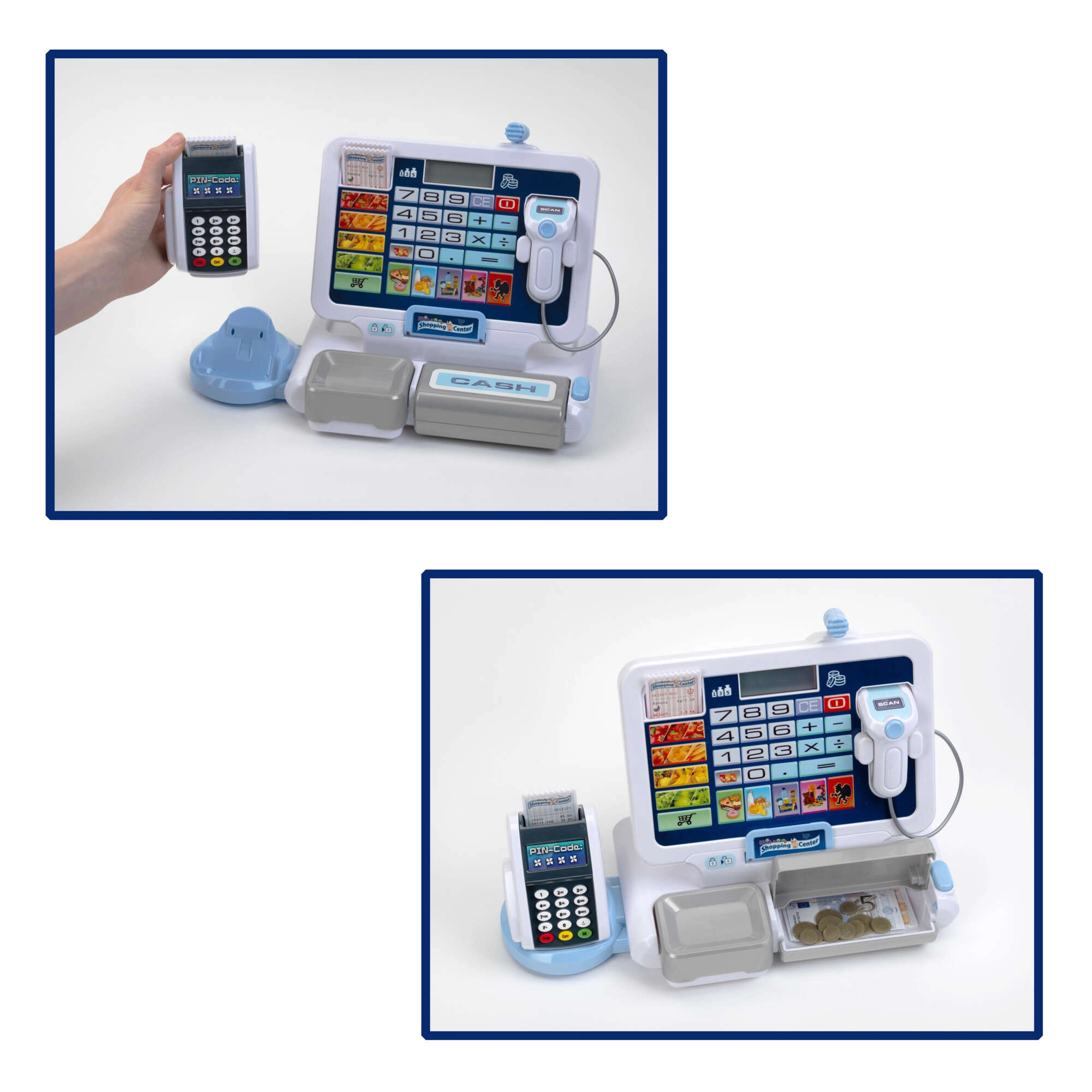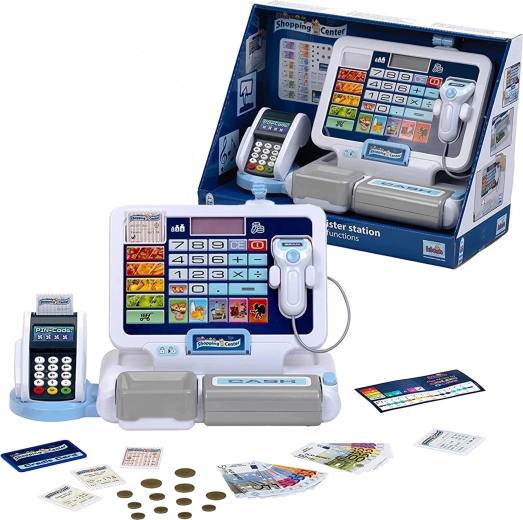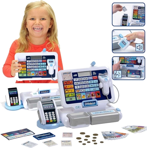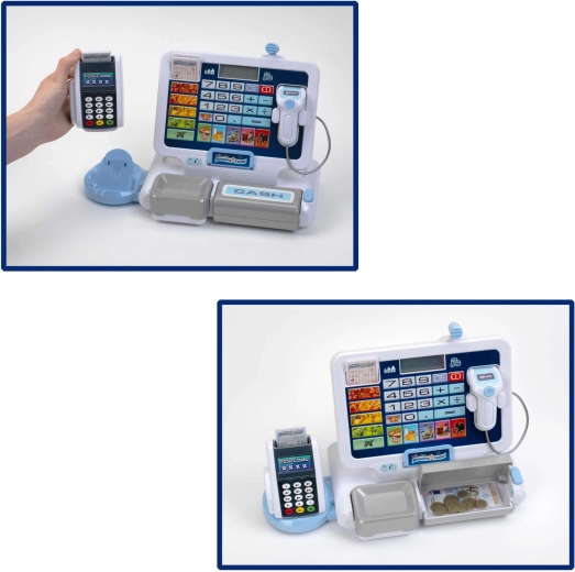 Elektroninė vaikiška kasa atkartoja tikrą kasą: turi aiškų ekraną su skaičiuotuvu, kortelių skaitytuvą, skaitytuvą ir iššokantį grynųjų stalčių su atpažįstamu „spragtelėjimu“. Vaikai gali „nuskaityti“ prekes, įvesti kainas ir leisti kasai viską automatiškai sudėti. Pilkai balta spalvų gama atrodo moderniai ir tvarkingai.