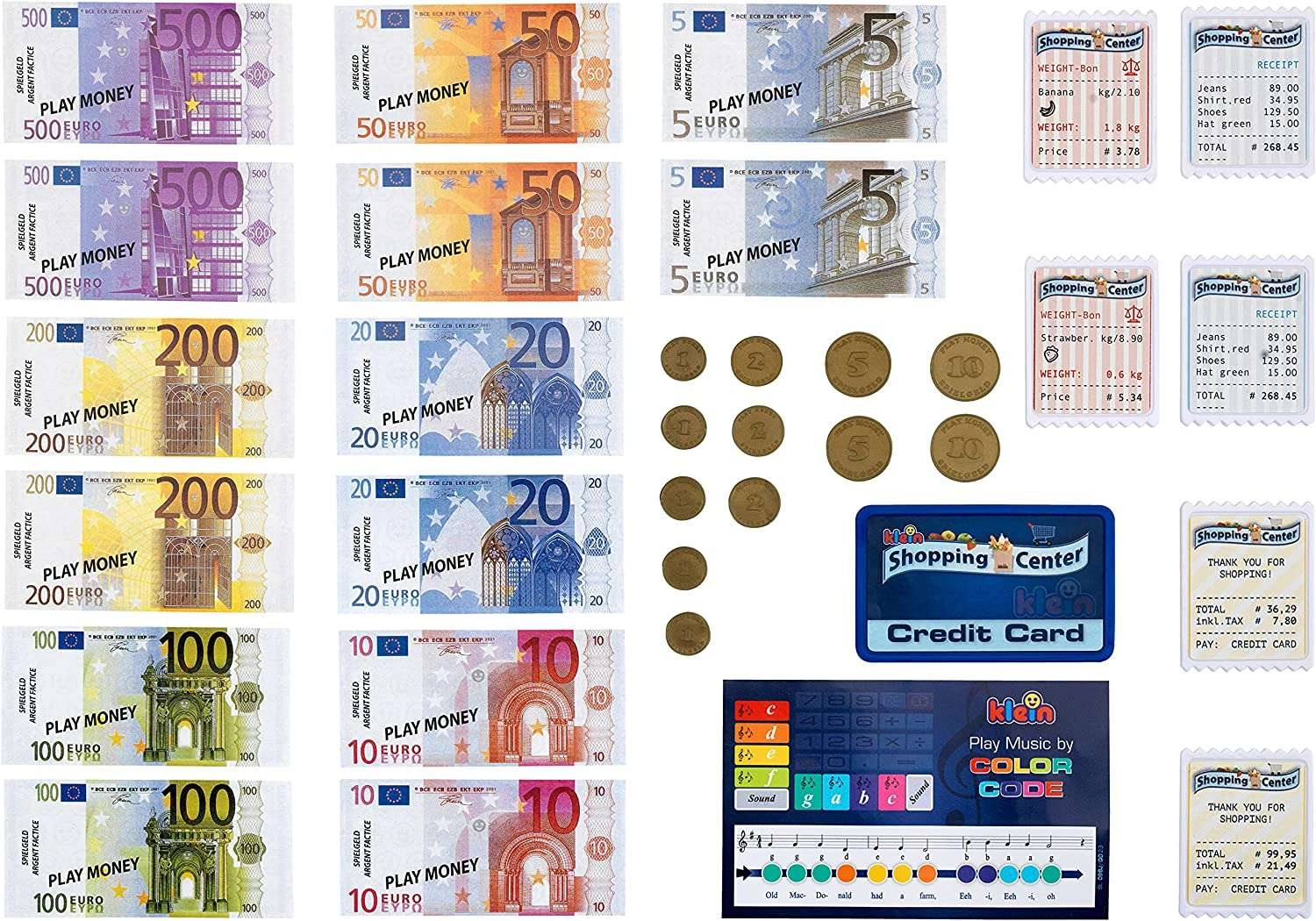 Rinkinyje yra kartoninės monetos, popieriniai banknotai, keli kvitai, mokėjimo kortelė ir kortelė su dainelėmis – viskas pilnam parduotuvės žaidimui.