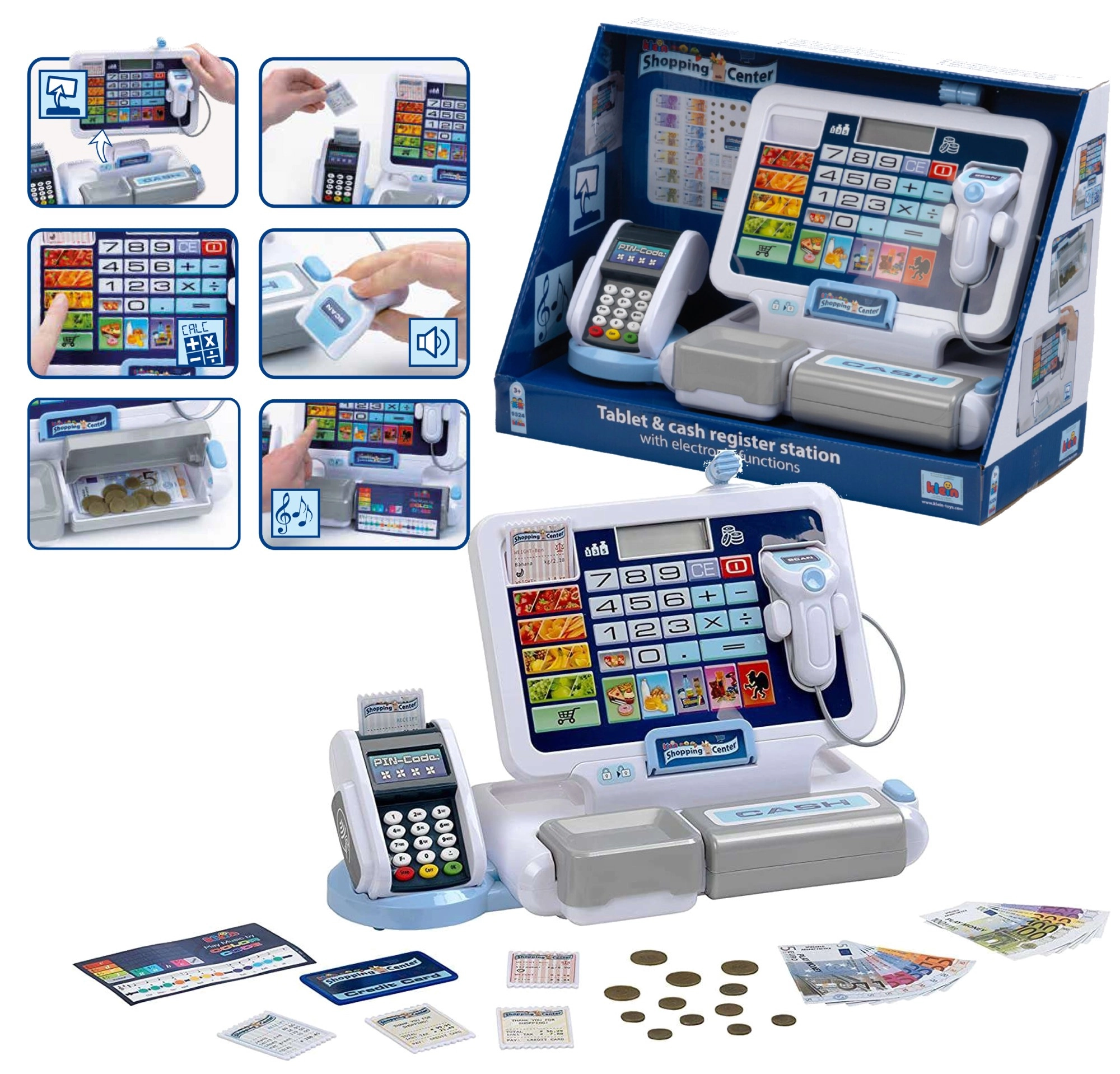 - Realistiškos funkcijos: ekranas su skaičiuotuvu, skaitytuvas, kortelių skaitytuvas, kasos garsai.
