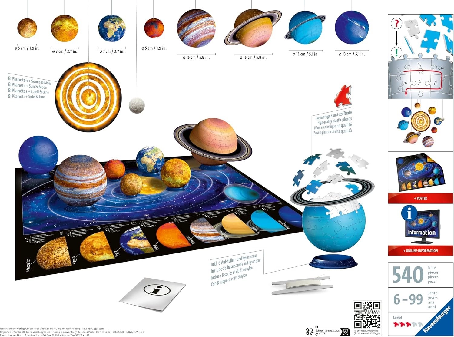 Dėl aukštos RAVENSBURGER kokybės dėliojimas yra sklandus, įdomus ir informatyvus. Baigtas planetas galite pakabinti arba pastatyti ant stovelio ir namuose sukurti įspūdingą kosmoso modelį. Taip pat pridėtas dvišalis plakatas su informacija (užrašai užsienio kalba) ir iliustruota instrukcija lengvam startui.