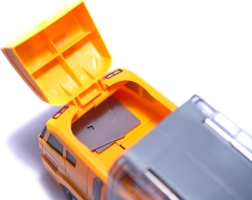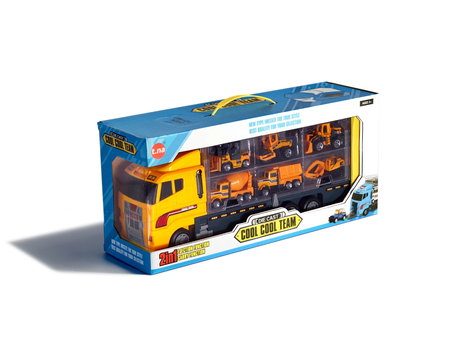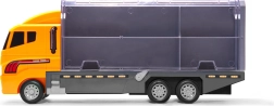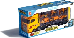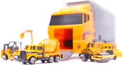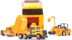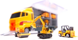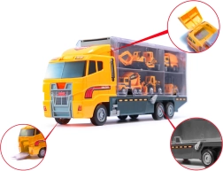 Didelis rinkinys mažiesiems statytojams: tvirtas vilkikas su skaidriu dangčiu tarnauja kaip dėklas–organizatorius ir pervežėjas 6 mini statybiniams automobiliams (ekskavatorius, krautuvas, betono maišyklė ir kt.). Dėl atsiveriančio gaubto ir išvažiuojančios rampos mašinėlės lengvai išrieda paspaudus mygtuką. Žaislas pagamintas iš patvaraus ABS plastiko, turi realistiškų detalių ir yra lengvas nešiotis – idealu namuose, kelionėse ir darželyje.
