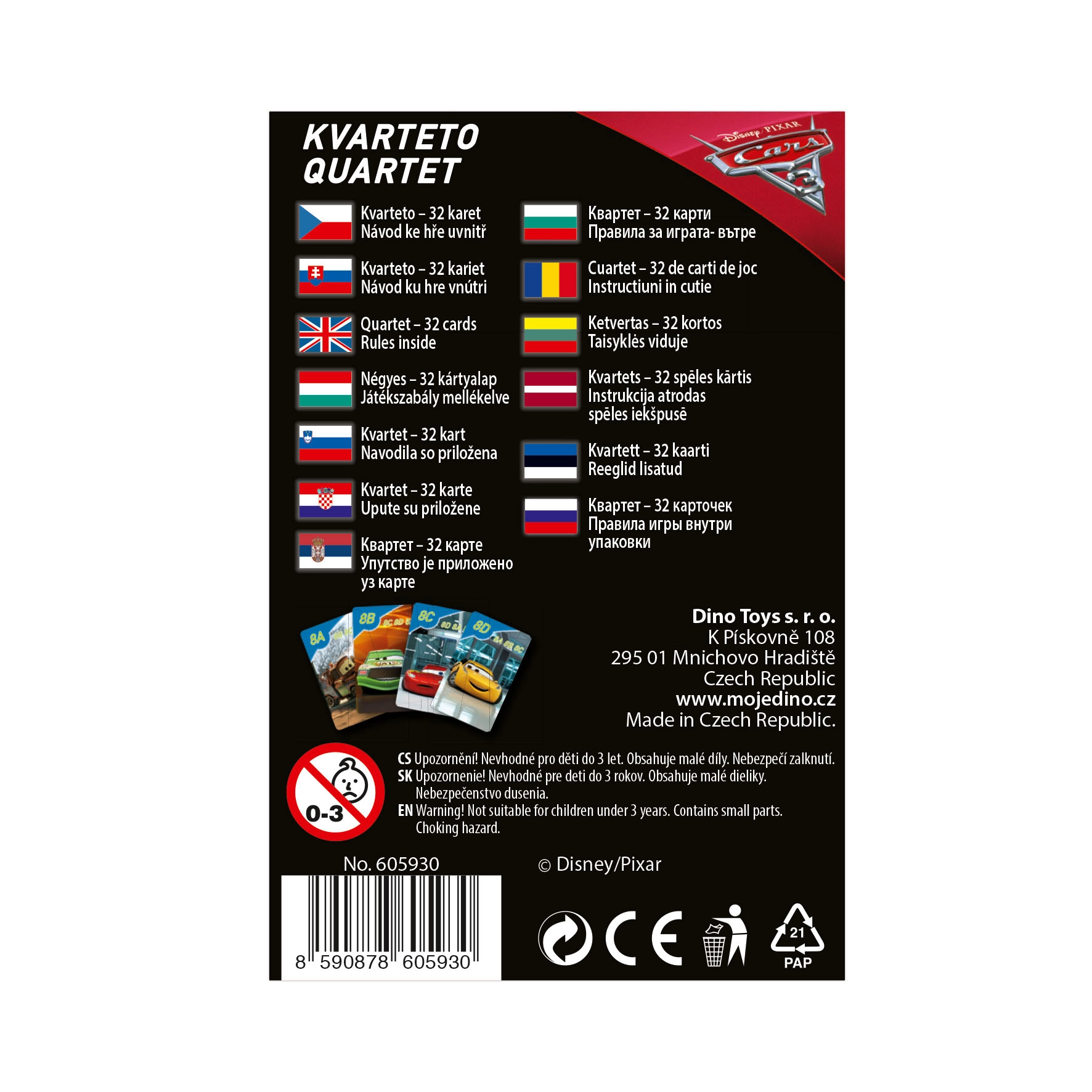 Leiskitės į mažųjų automobiliukų pasaulį su Cars 3 Quarteto kortomis, kur lenktyniauja Žaibas McQueenas, Materis ir Cruz Ramirez. Šis kortų žaidimas idealiai tinka 3–6 vaikams, norintiems smagiai leisti laiką kartu. Pagrindinis žaidimo tikslas – surinkti kuo daugiau ketvertų kortų su tuo pačiu simboliu.