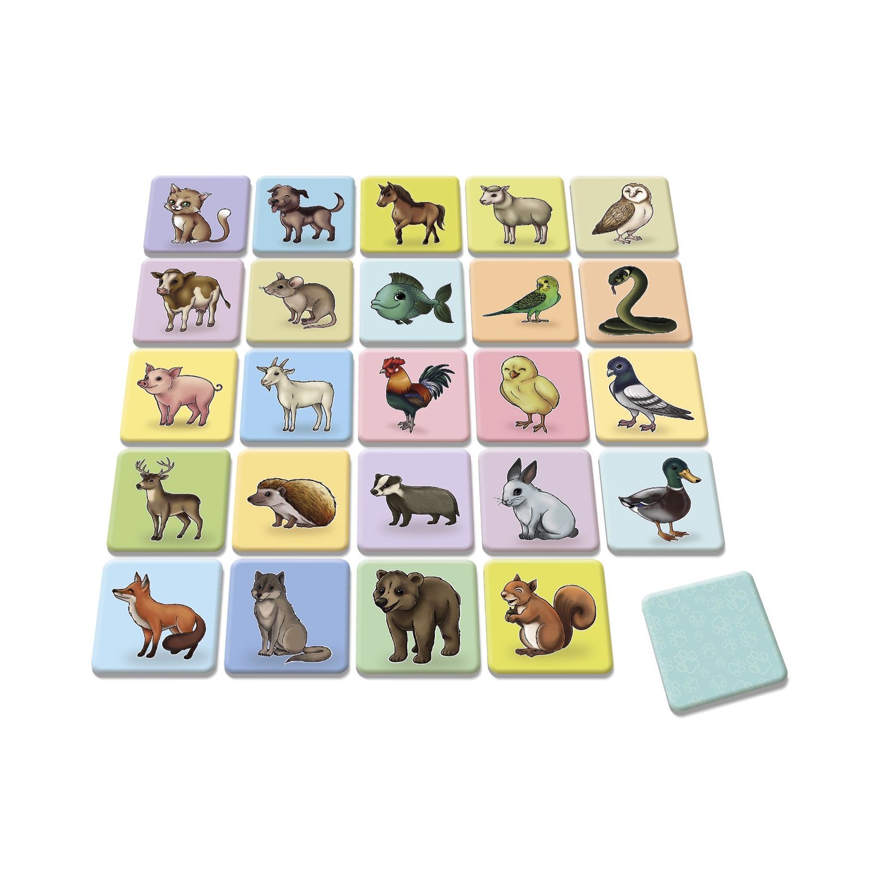 Kartoninės kortelės papuoštos spalvingomis gyvūnų iliustracijomis, kurios patiks kiekvienam žaidėjui.