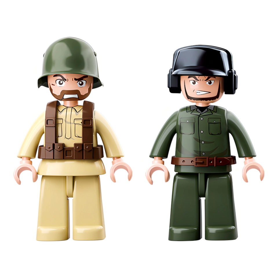 Dvi kareivių figūrėlės su judriomis galūnėmis, kas prideda žaidimui interaktyvumo.