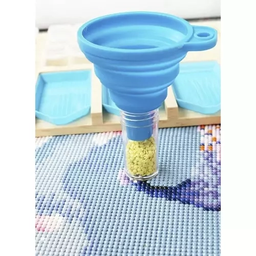 Silikoninis sulankstomas piltuvėlis ir rūšiavimo lėkštelės leidžia patogiai persijoti be išbarstymo – idealu smulkiems kristalams ir karoliukams.