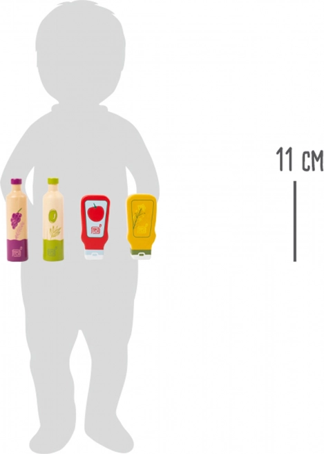 Šis medinis prieskonių/užpilų rinkinys – puikus bet kurios vaikų virtuvėlės papildymas. Keturi buteliukai būdingų spalvų su aiškiais užrašais ir iliustracijomis (aliejus, actas, kečupas, garstyčios) padeda natūraliai mokytis, skirti formas ir spalvas, kartu skatina kūrybišką žaidimą.