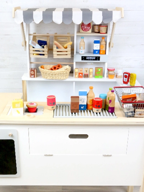 Puikiai tinka kaip vaikiškos virtuvėlės, parduotuvės ar prekystalio papildymas. Vaikai gali „apsipirkti“, rūšiuoti ir tvarkyti maisto produktus, plėsti žodyną ir mokytis apie sveiką mitybą. Saugios medžiagos ir glotnus apdirbimas užtikrina patogų ir saugų naudojimą.