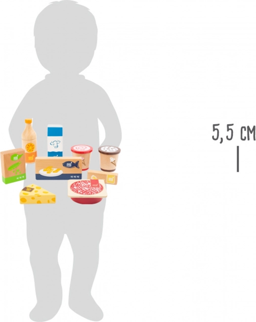 Rinkinyje yra apelsinų sultys, dvi pakuotės ledų, žirnelių pakuotė, žuvies piršteliai, sviestas, sūris, pjaustyta dešra ir pieno pakelis. Tikroviški atspaudai ir natūrali išvaizda patraukia dėmesį iš pirmo žvilgsnio. Dėl tvirto medžio rinkinys yra patvarus ir paruoštas kasdieniam žaidimui.