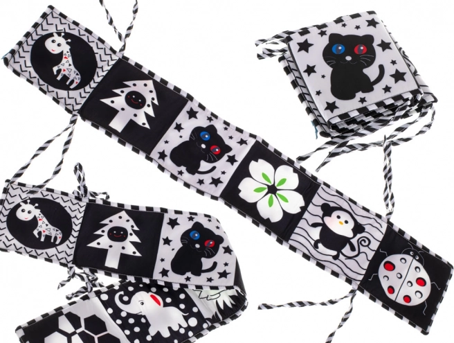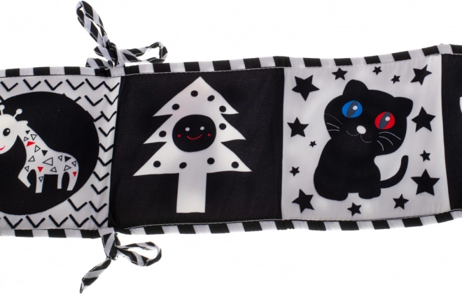 Kontrastinė sensomotorinė knygelė, sukurta kaip lovytės apsauga, yra puikus pasirinkimas vaikams, kurie pradeda pažinti pasaulį. Akordeono formos knygelę galima lengvai pritvirtinti prie lovytės naudojant raištelius, kas suteikia ne tik pramogą, bet ir saugumą.