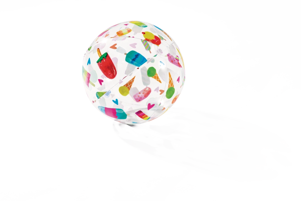 Skaidrų kamuolį puošia spalvingi vaisių, ledų, žuvyčių ir jūrinių motyvų atvaizdai. Motyvas parenkamas atsitiktinai, tačiau visada suteikia linksmą išvaizdą ir gerą matomumą tiek vandenyje, tiek paplūdimyje.