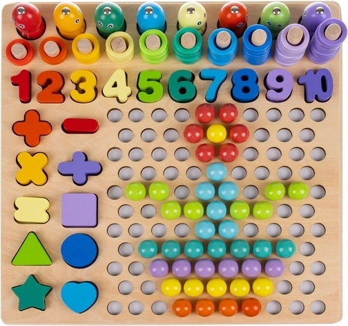 Medinė lenta su išpjovomis, skaitmenys, simboliai ir figūros moko vaikus pirmųjų skaičiavimo žingsnių ir logikos. Dėliojimas pagal pavyzdžius skatina koncentraciją ir padeda suprasti matematikos pagrindus.
