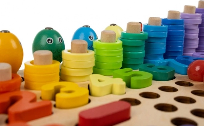 Šis išsamus medinis mokomasis rinkinys sujungia mozaiką su karoliukais, figūrų dėliojimą ir magnetinę žūklę. Vaikai žaismingai lavina skaičiavimą, spalvų rūšiavimą ir formų atpažinimą, kartu tobulina smulkiąją motoriką ir griebimą naudodami pincetą, lazdeles ir šaukštelį. Tinka savarankiškam žaidimui ir bendram mokymuisi su tėvais.