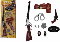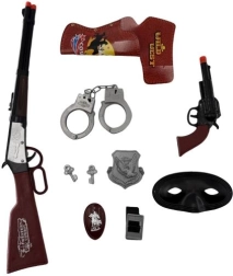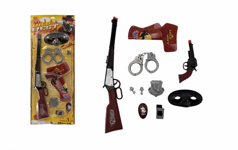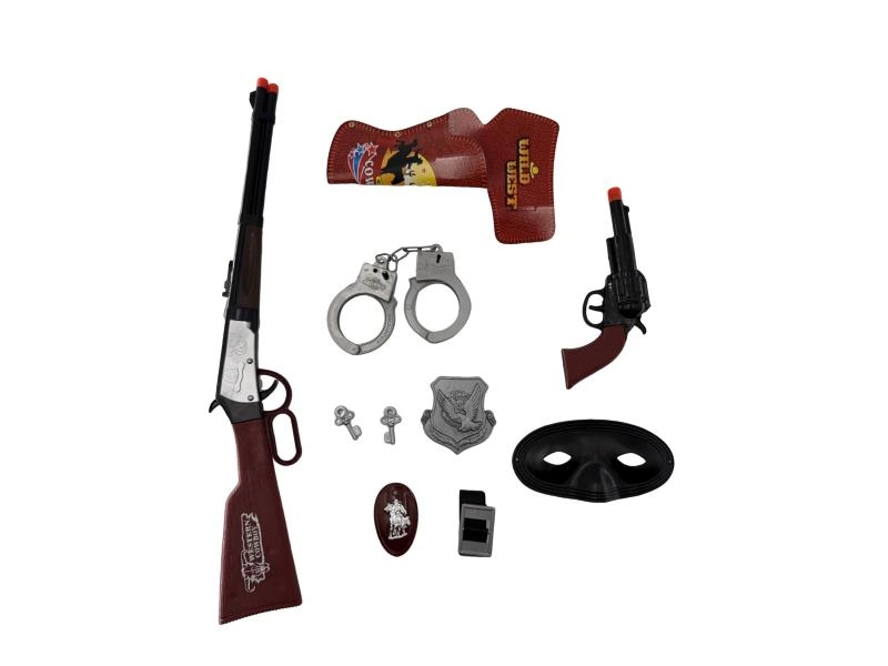 Linksmas rinkinys mažiesiems kaubojams: pistoletas, antrankiai ir koltas kūrybingiems Laukinių Vakarų žaidimams. Idealu vaikų persirengimams ir namų nuotykiams. Skatina kūrybiškumą, vaidmenų žaidimą ir saugų linksmą laiką.