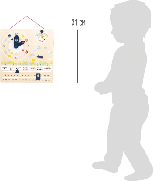 Aiški medinė lentelė sujungia laikrodį, kalendorių ir orų indikatorius. Ryškūs elementai ir aiškios piktogramos palengvina supratimą ir skatina smagų kasdienį mokymąsi.