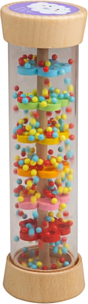 Bigjigs Baby lietaus cilindras – tai pojūčių žaislas, žavinantis raminančiu šnaresiu ir ryškiomis spalvomis. Permatomo cilindro viduje rutuliukai rieda per spalvotus diskus, taip imituodami švelnų lietų. Abu galus puošia mieli saulės ir debesėlio motyvai, kurie stiprina vizualinį suvokimą.
