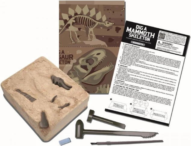 Šis interaktyvus kasinėjimo rinkinys jūsų stalą pavers maža paleontologine radimviete. Naudodamiesi pridėtu kalteliu ir šepetėliu, vaikai atsargiai atidengia atskirus kaulus, o vėliau iš jų surenka detalų mamuto griaučių modelį. Taip pramoga susijungia su mokymusi, o rezultatas – įspūdingas eksponatas vaikų kambariui.