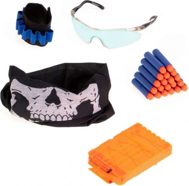 Komplektinis vaikų rinkinys putų strėlėms: patogi taktinė liemenė su laikikliais ir kišenėmis, 20 putų strėlių, plastikinis dėtuvė 6 strėlėms, riešo dirželis amunicijai, apsauginiai akiniai mėlyni ir bandana. Liemenė turi kvėpuojantį tinklelį, universalų vaikišką dydį ir reguliuojamą lipnią juostą patogiam dėvėjimui.