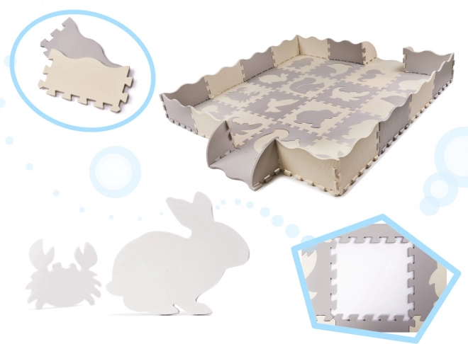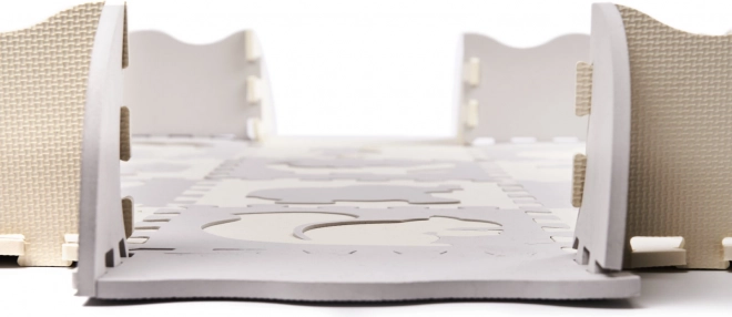 Minkštas vaikų kilimėlis iš putų dėlionių su išimamomis formomis sukuria saugią ir kūrybišką žaidimų erdvę. Dėl paaukštintų kraštų galima surinkti aptvarą, kuris laiko žaislus viduje. Kilimėlis yra atsparus vandeniui, turi neslystantį paviršių ir puikiai sugeria smūgius, todėl idealiai tinka pirmajiesiems žingsniams. Neutrali pilka ir ecru spalva dera prie bet kokio interjero.