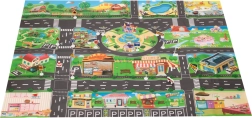 Paklotė vaizduoja miesto peizažą su keliais, pastatais ir parkais, kas skatina vaikų vaizduotę ir kūrybiškumą žaidžiant su žaislais.
