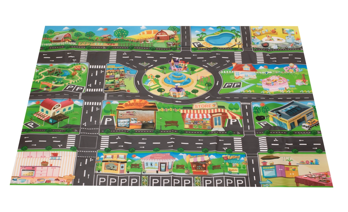 Didelė atspari vandeniui paklotė vaikams su miesto atspaudu idealiai tinka kūrybiškiems žaidimams. Ji pagaminta iš plastiko, primenančio staltiesinę medžiagą, todėl lengva prižiūrėti ir valyti. Dėl nedidelio svorio ir sulankstymo galimybės ją patogu nešiotis ir naudoti ne tik namuose, bet ir lauke, pavyzdžiui, per iškylą.