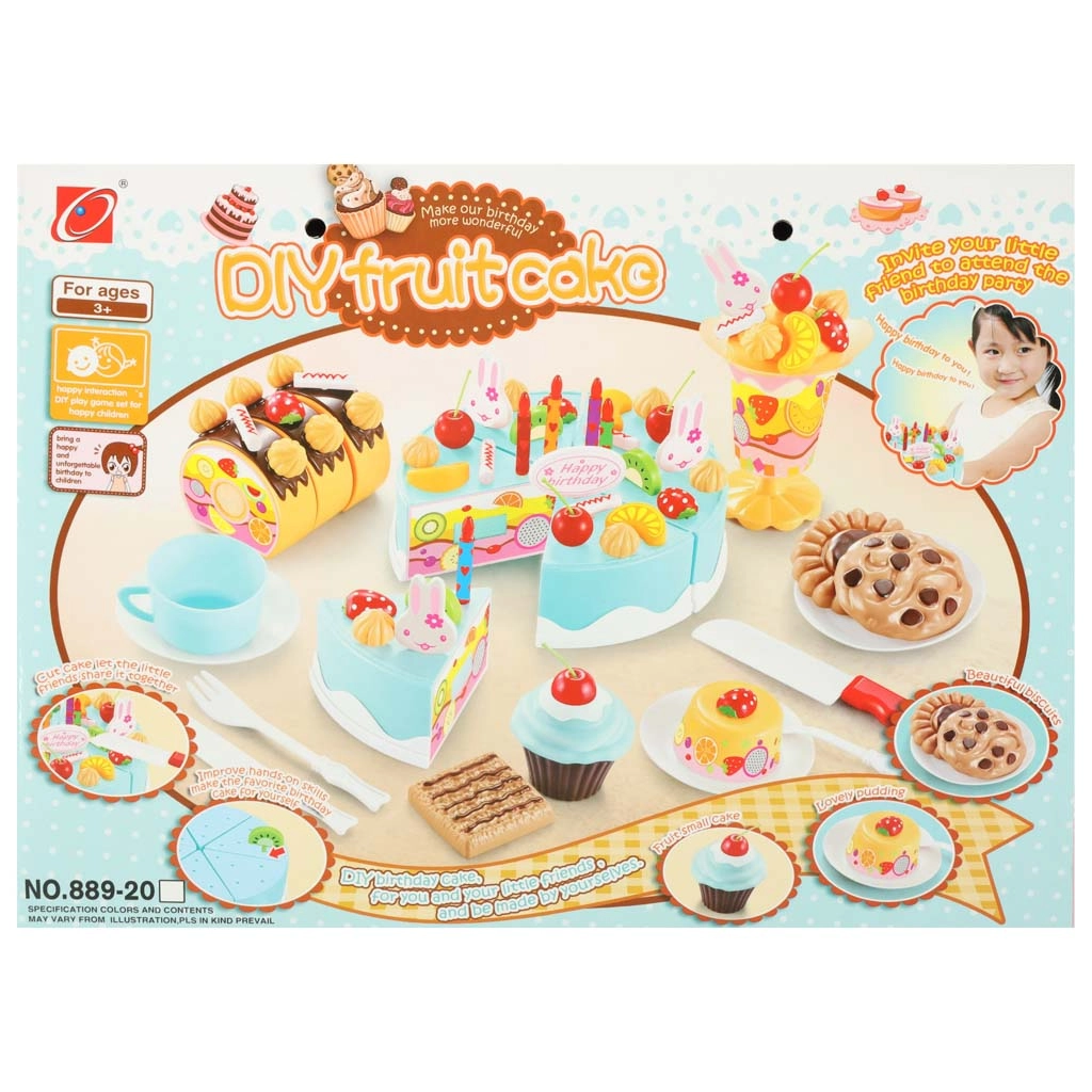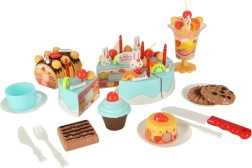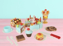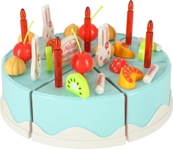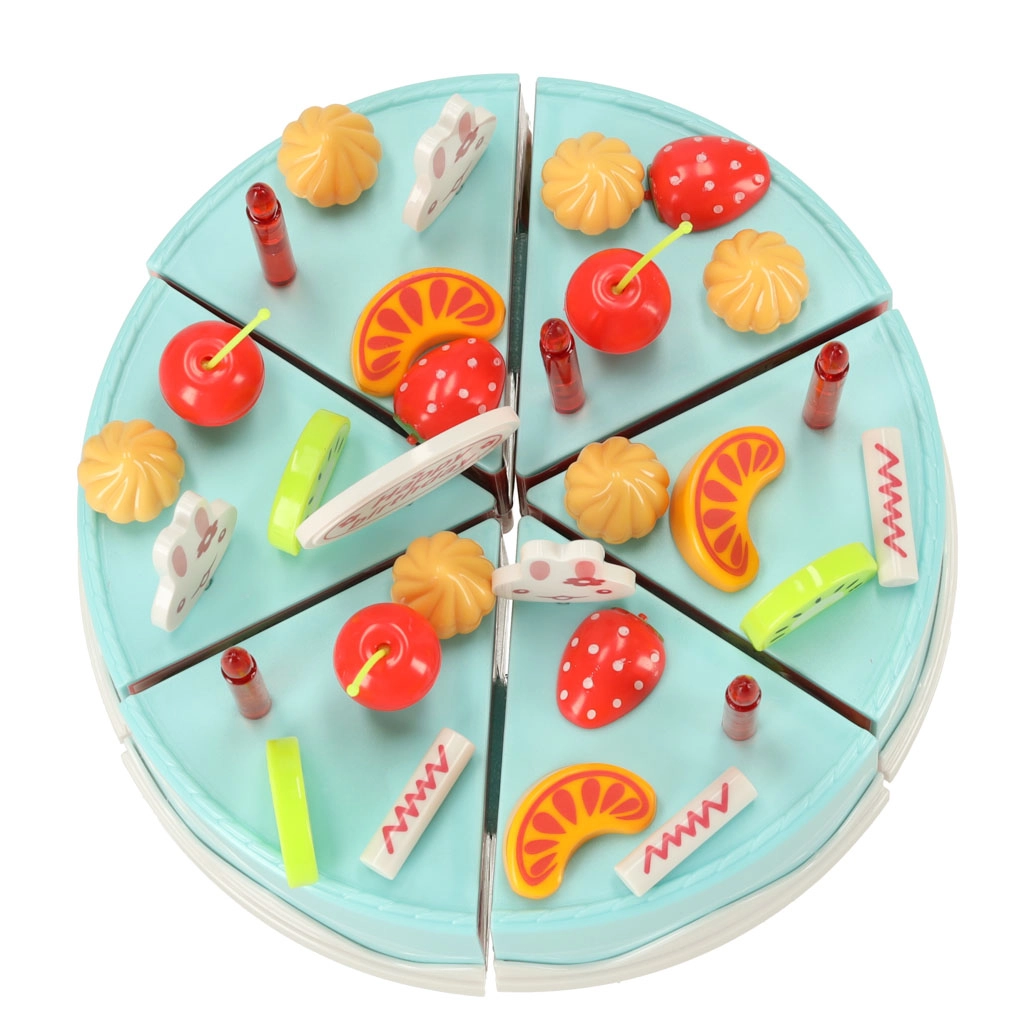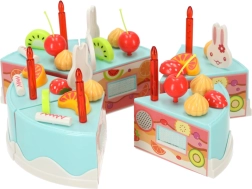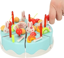 Praskaidrinkite vaikų šventę su šiuo mėlynu pjaustomu gimtadienio tortu – 75 dalių rinkinys, pilnas vaisių, žvakučių ir priedų žaidimams „konditerijoje“. Dėl lipnių juostelių (Velcro) jungčių vaikai lengvai perpjaus ir vėl sudės tortą, puoš pagal fantaziją ir lavins smulkiąją motoriką bei socialinius įgūdžius. Pagaminta iš saugaus ABS plastiko, tinkama nuo 3 metų.