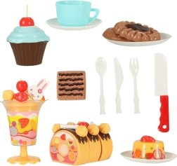 - Rinkinio turinys (75 vnt.): 6× torto dalis, 5× žvakutė, 14× bezė, 7× saldainių lazdelė, 4× vyšnytė, 4× mandarinas, 3× braškė, 3× kivis, 4× triušelis, 1× užrašas, 3× lėkštutė, 3× sausainis, 3× vyniotinio gabalėlis, 3× keksiukas, 1× puodelis, 1× šaukštelis, 1× šakutė, 1× peiliukas, 1× torto mentele, 1× ledų taurė, lipdukų rinkinys, lipnių juostelių (Velcro) rinkinys.