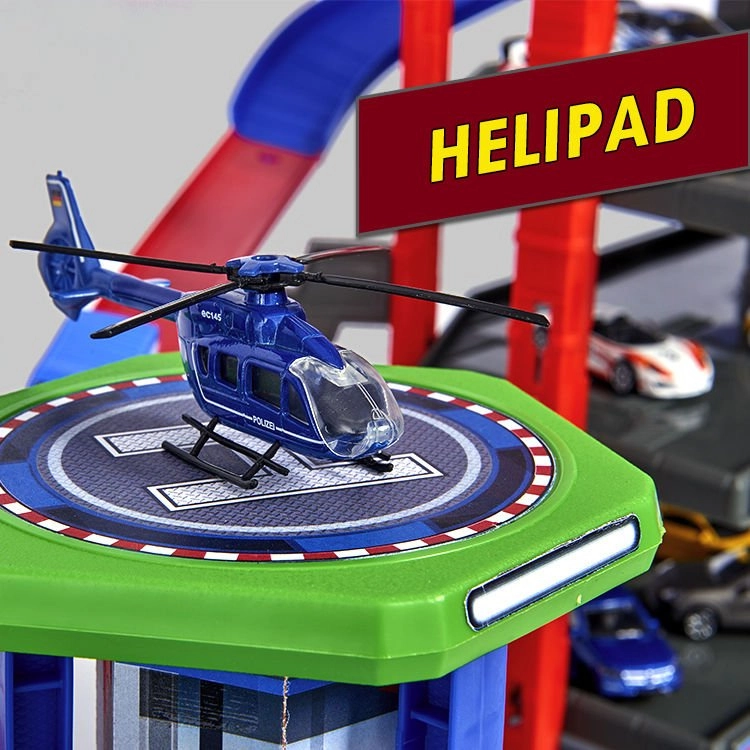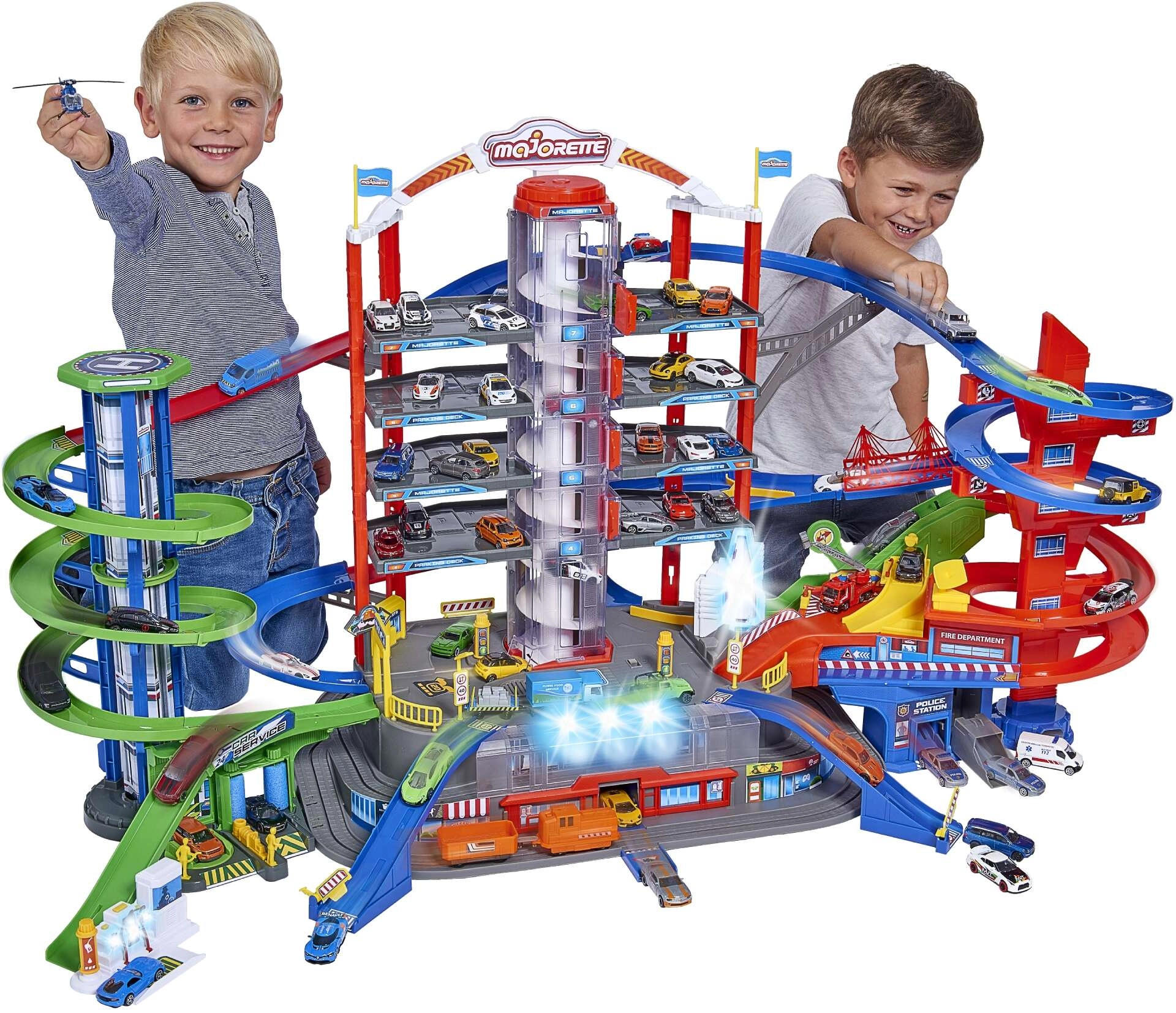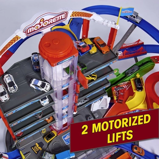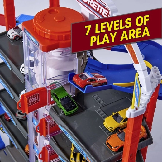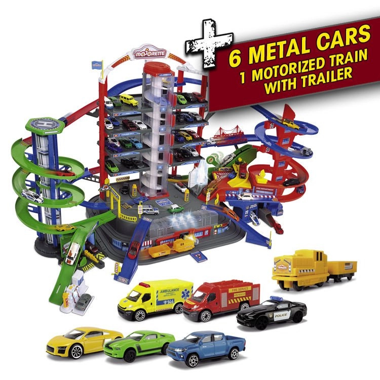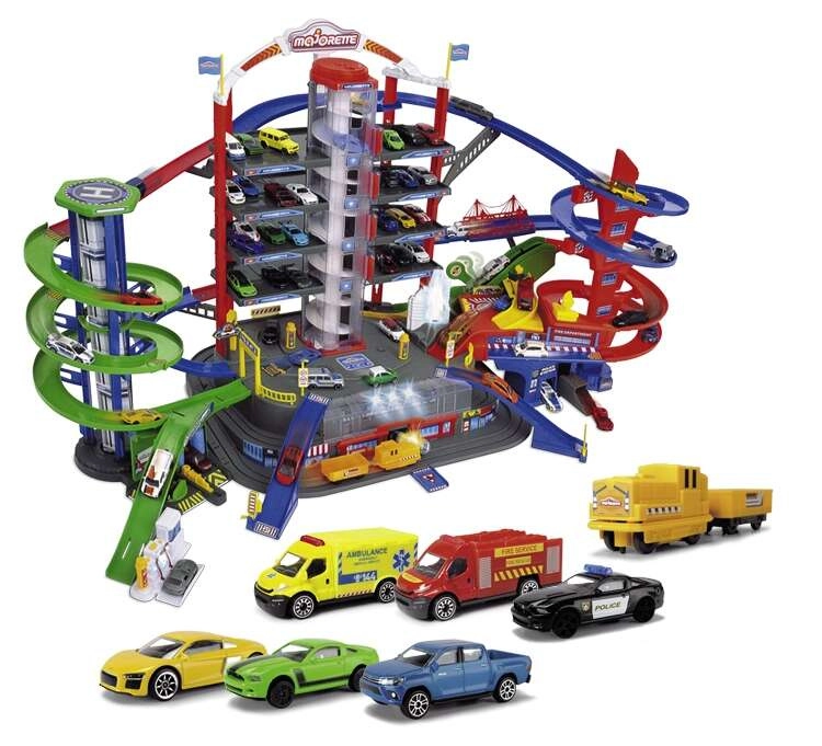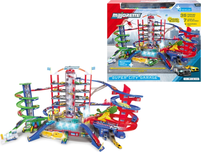 Atraskite mega rinkinį mažiesiems vairuotojams: 7 aukštų garažų kompleksas Super City su liftu, spiralinių rampų sistema ir 6 metalinėmis mašinėlėmis, papildytomis lokomotyvu su šviesos ir garso efektais. Yra sraigtasparnių aikštelė, policijos ir gaisrinės stotys, plovykla ir degalinė su garsais ir šviesomis – viskas maksimaliai veiksmingam ir kūrybiškam žaidimui.