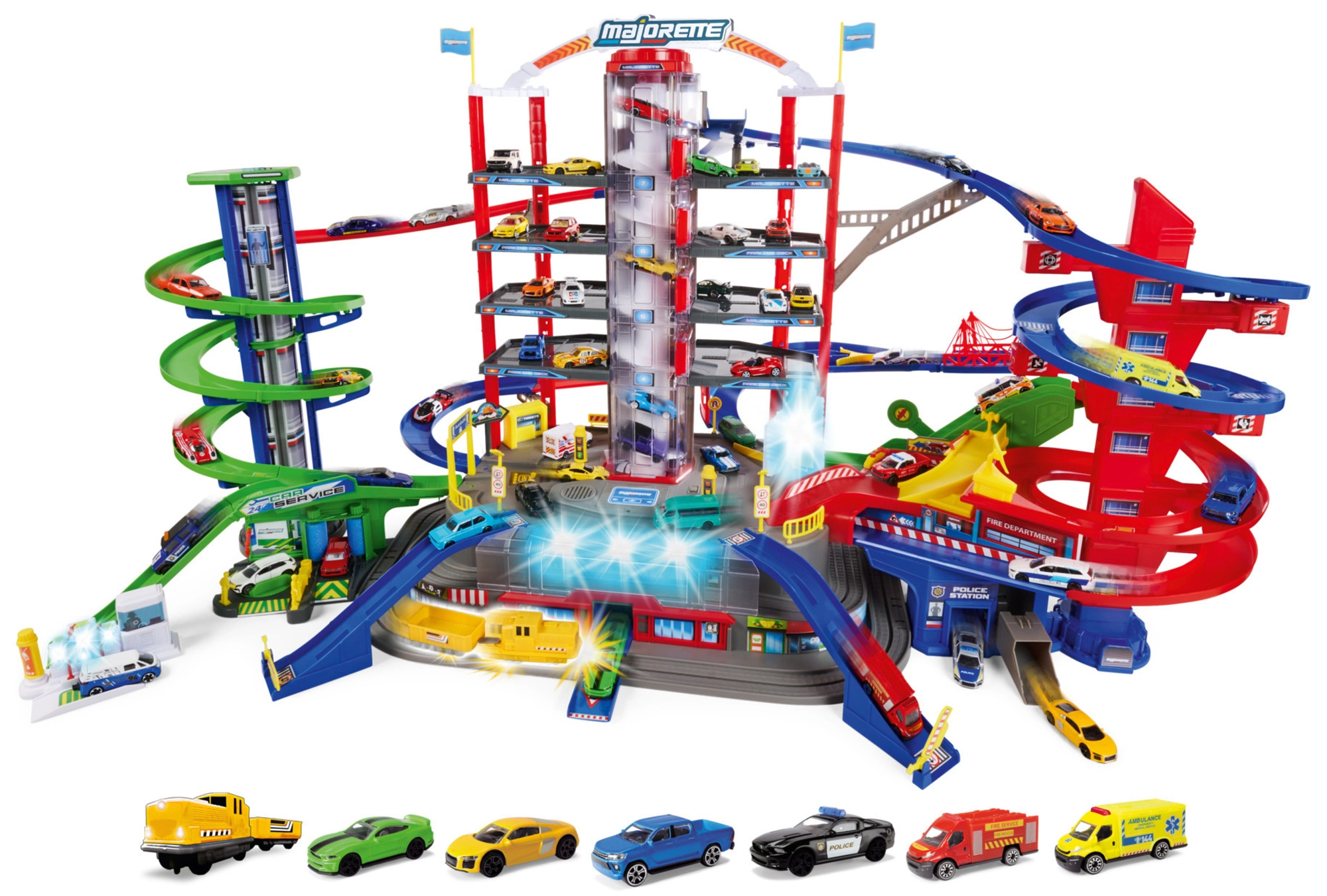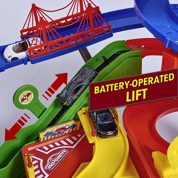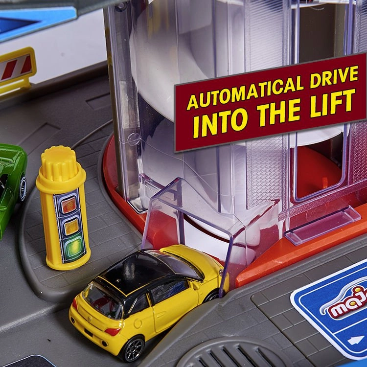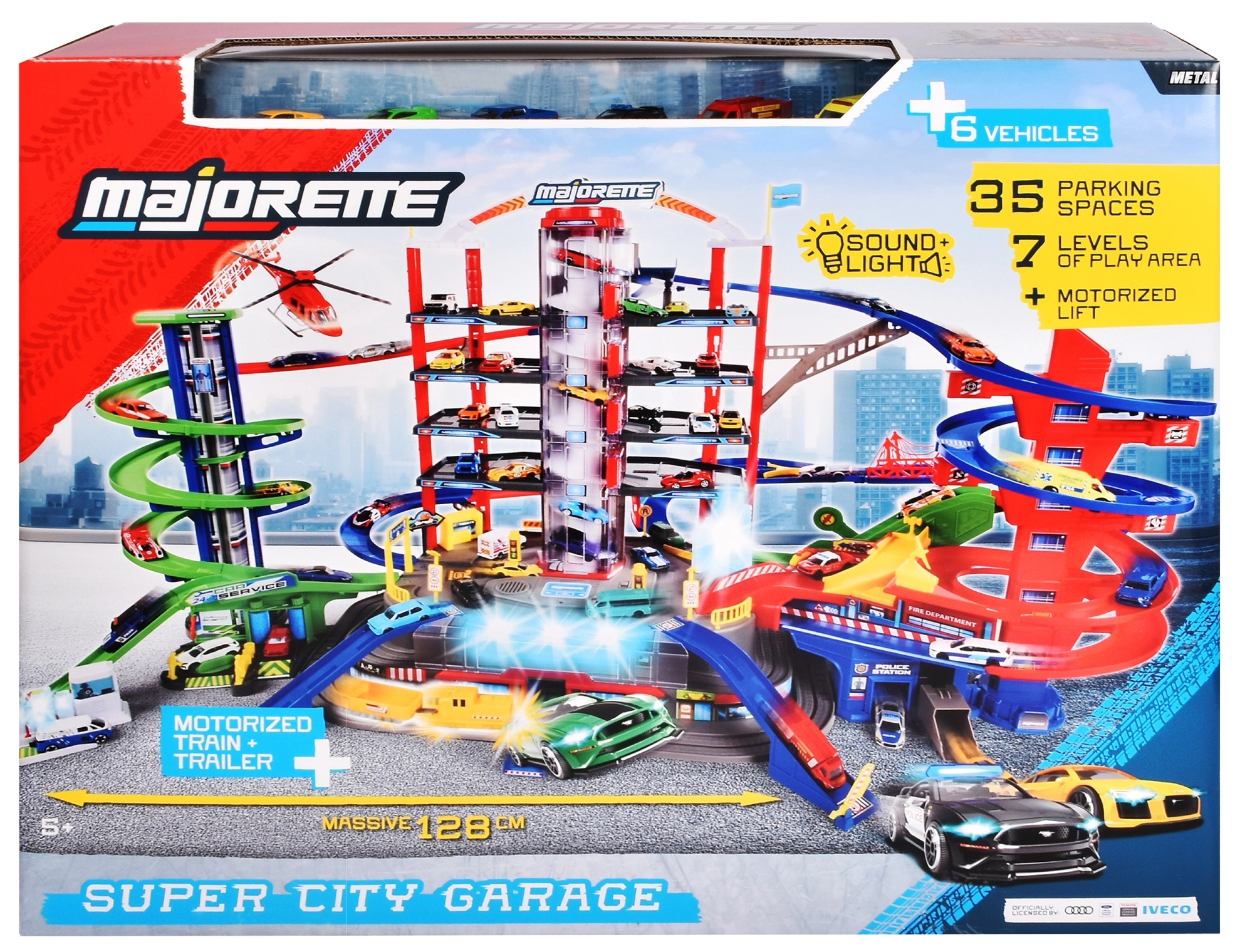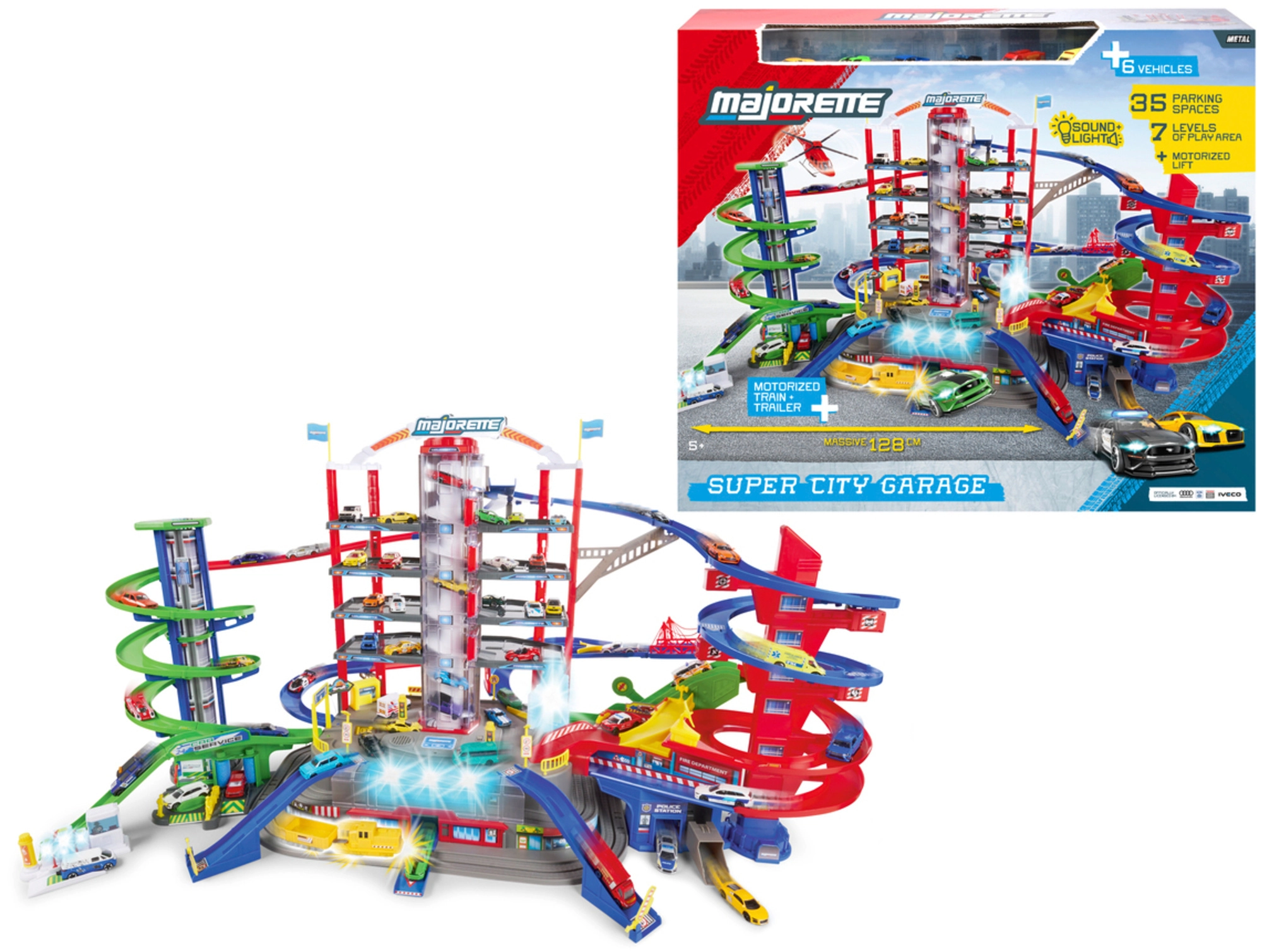 Atraskite mega rinkinį mažiesiems vairuotojams: 7 aukštų garažų kompleksas Super City su liftu, spiralinių rampų sistema ir 6 metalinėmis mašinėlėmis, papildytomis lokomotyvu su šviesos ir garso efektais. Yra sraigtasparnių aikštelė, policijos ir gaisrinės stotys, plovykla ir degalinė su garsais ir šviesomis – viskas maksimaliai veiksmingam ir kūrybiškam žaidimui.