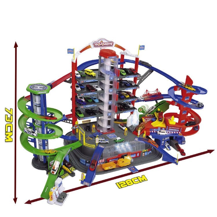 Šis didelis garažų rinkinys vaikams suteikia begalines žaidimo galimybes per septynis aukštus. Spalvingos spiralinės trasos, baterijomis maitinamas liftas ir realistiški šviesos bei garso efektai įtrauks kiekvieną mažą automobilių ir traukinių entuziastą. Metalinės mašinėlės su laisvai besisukančiais ratukais sklandžiai važiuoja rampos, o lokomotyvas su vagonu rieda per slaptą tunelį ir stoja geležinkelio stotyje.