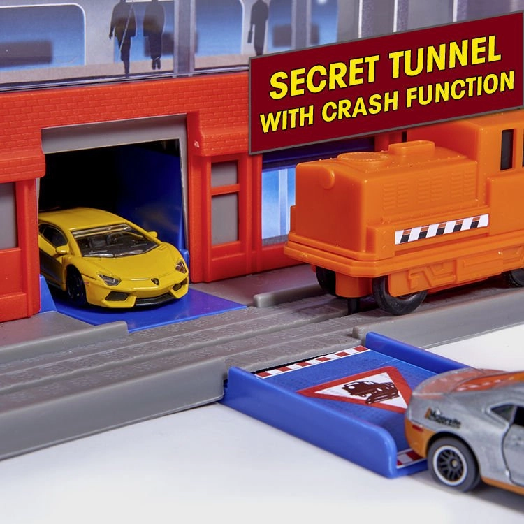 Degalinė ir geležinkelio stotis su šviesos ir garso efektais, be to, lokomotyvas su vagonu dar įvairesniems scenarijams.