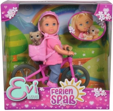 Mieloji lėlytė Evi pasiruošusi išvykai dviračiu – jai netrūksta dviratininko šalmo, stilingo dviračio ir ištikimo šuniuko kuprinėje. Idealiai tinka vaikams nuo 3 metų, skatina vaizduotę ir judrius siužetus.