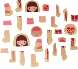 Išmani ir žaisminga medinė sluoksninė dėlionė su mergaitės figūrėle moko vaikus pažinti žmogaus kūno anatomiją žingsnis po žingsnio. Dėl 5 sluoksnių (skeletas, organai, raumenys, kūnas, drabužiai) ir 28 detalių lavinama smulkioji motorika, susikaupimas ir loginis mąstymas. Patvarus medis ir glotniai nušlifuoti kraštai užtikrina saugų žaidimą pagal Montessori principus.