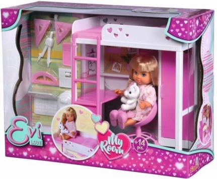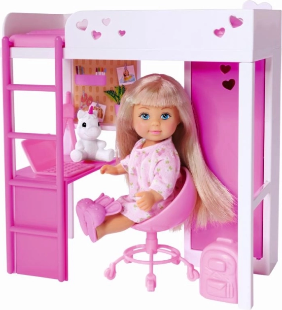 Atraskite magišką kambarėlį, kuriame lėlytė Evi leidžia laiką žaisdama, mokydamasi ir ilsėdamasi. Šiuolaikiška loftinė lova su kopėtėlėmis taupo vietą, o po ja slepiasi patogus darbo kampelis su rašomuoju stalu ir daiktų laikymo erdve. Visa tai derinama baltai rožinėje spalvų gamoje su subtiliomis širdelėmis – tai pradžiugins kiekvieną mažąją dizainerę.