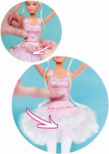 Lėlė Steffi Love – šokanti balerina atneša elegantišką baleto patirtį į vaikų kambarį. Stilingas viršus su blizgiais akcentais ir rožinis tutu sijonas kuria žavų įvaizdį, o rožės formos mygtukas įjungia sijonėlio sukimąsi, suteikdamas tikro pasirodymo efektą.