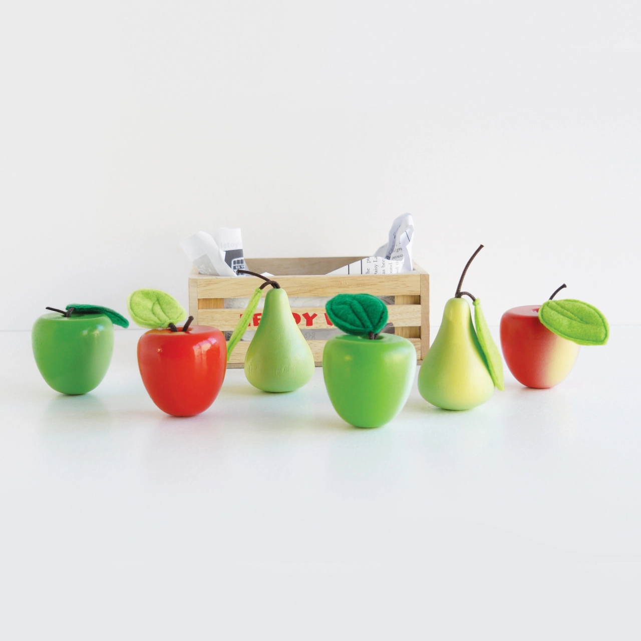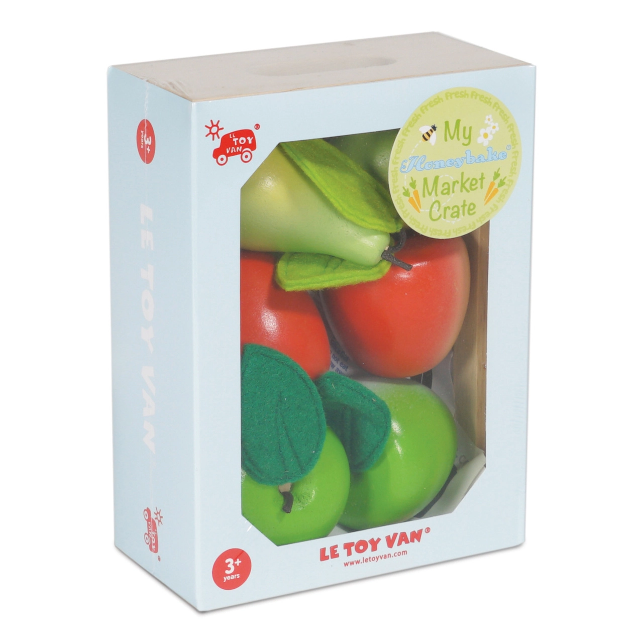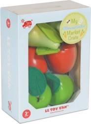 Mėgaukitės „turgaus diena“ su šia gražia LE TOY VAN medine dėžute, pilna vaisių. Rinkinyje yra du raudoni ir du žali obuoliai bei dvi žalios kriaušės su veltiniais lapeliais. Žaislas pagamintas iš tvarios medienos, nudažytas netoksiškais vandens pagrindo dažais ir puikiai tinka mažoms rankutėms. Skatina vaizduotės žaidimą, smulkiąją motoriką ir mokymąsi apie sveiką mitybą.