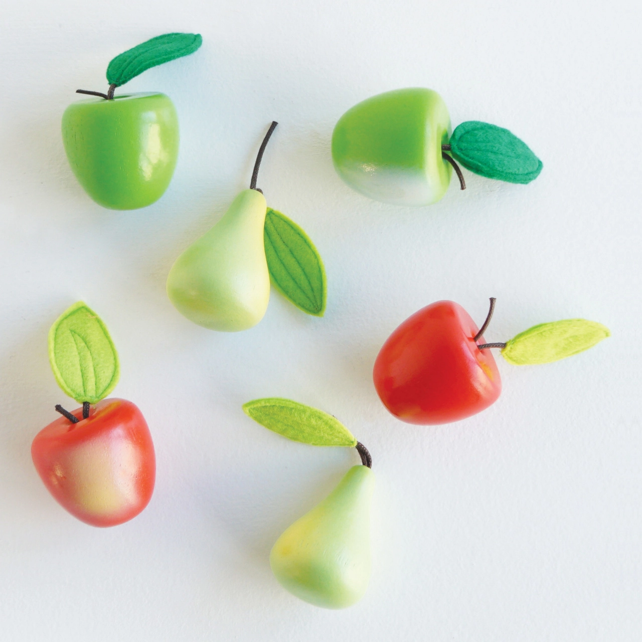 - 6 vaisių gabalėliai (2 raudoni obuoliai, 2 žali obuoliai, 2 žalios kriaušės) + 1 medinė dėžutė