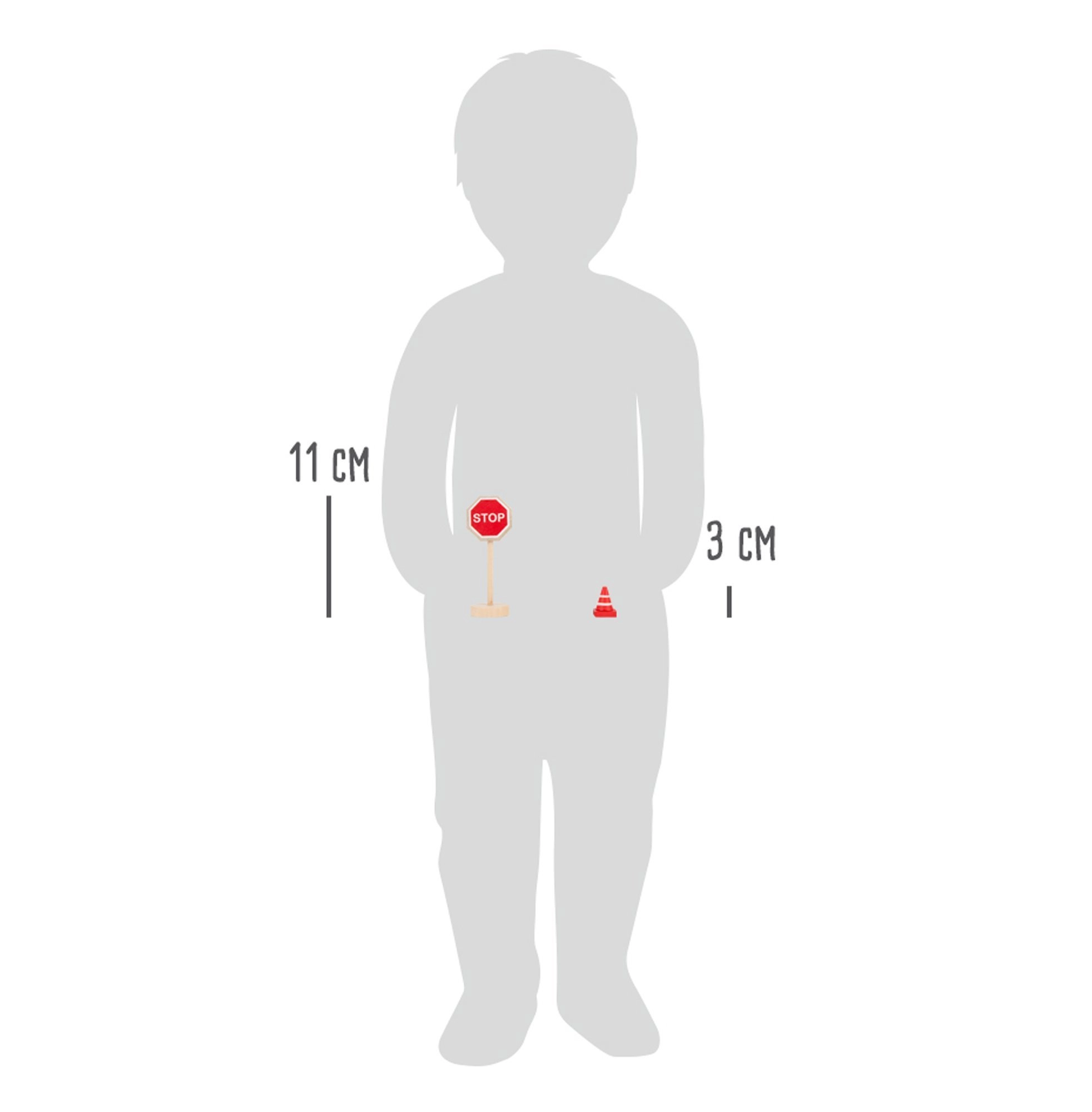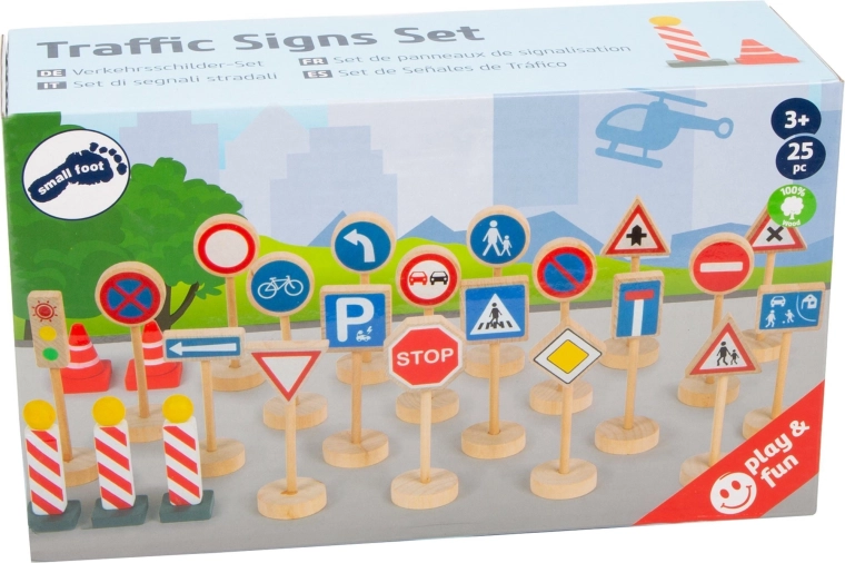 Šis kokybiškas medinis rinkinys suteikia viską, ko vaikams reikia susikurti savo eismo pasaulį. Jame rasite tokius ženklus kaip STOP, privaloma kryptis kairėn, lenkti draudžiama, pagrindinis kelias, pėsčiųjų perėja, stovėjimo aikštelė, taip pat šviesoforą, kūgelius ir užtvaras. Detalių aukštis maždaug 3–11 cm, jos gerai laikosi rankoje ir dėl stabilių pakojų tvirtai stovi.