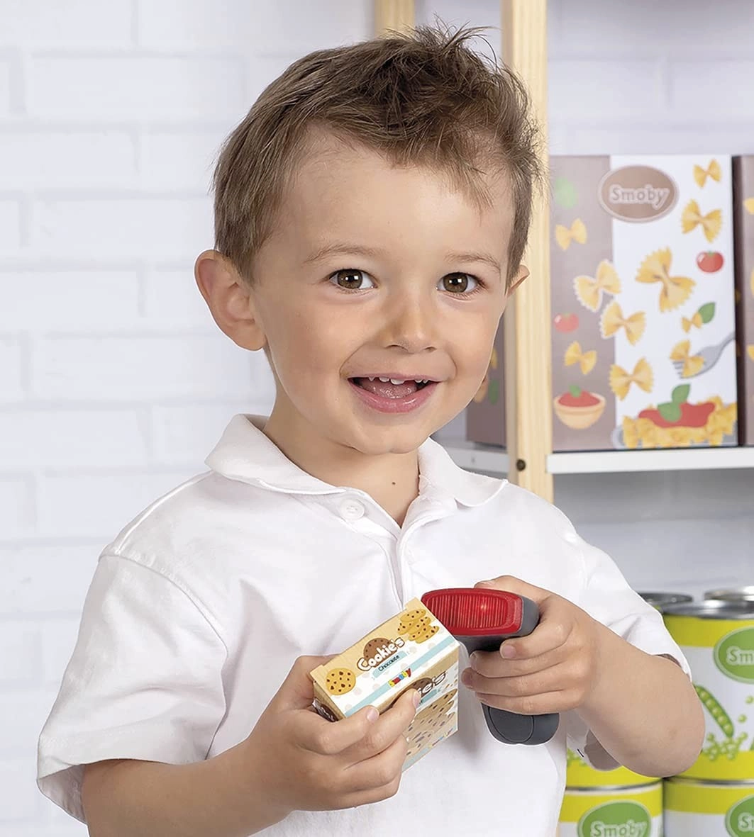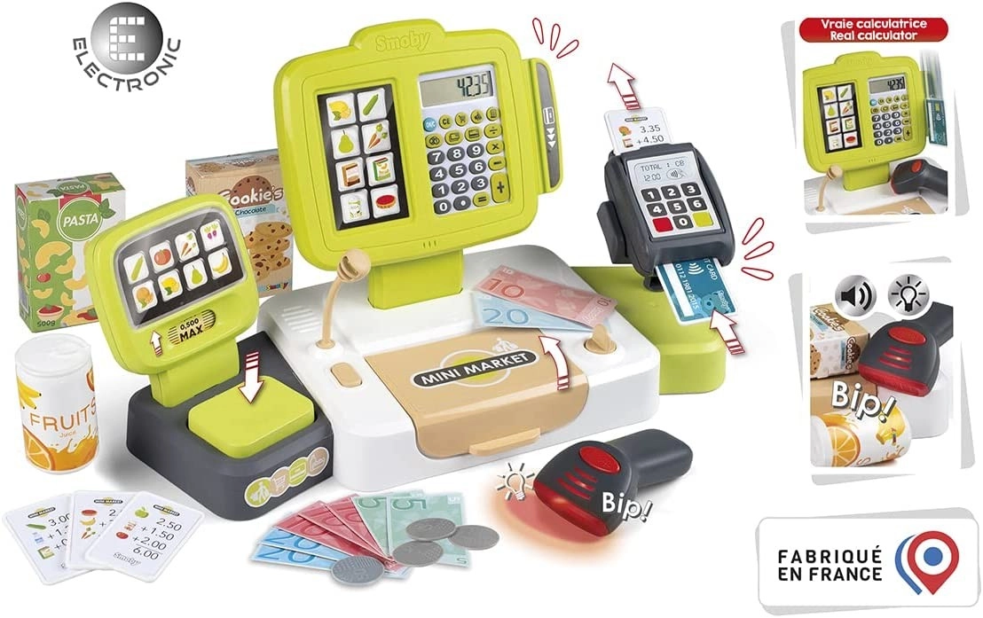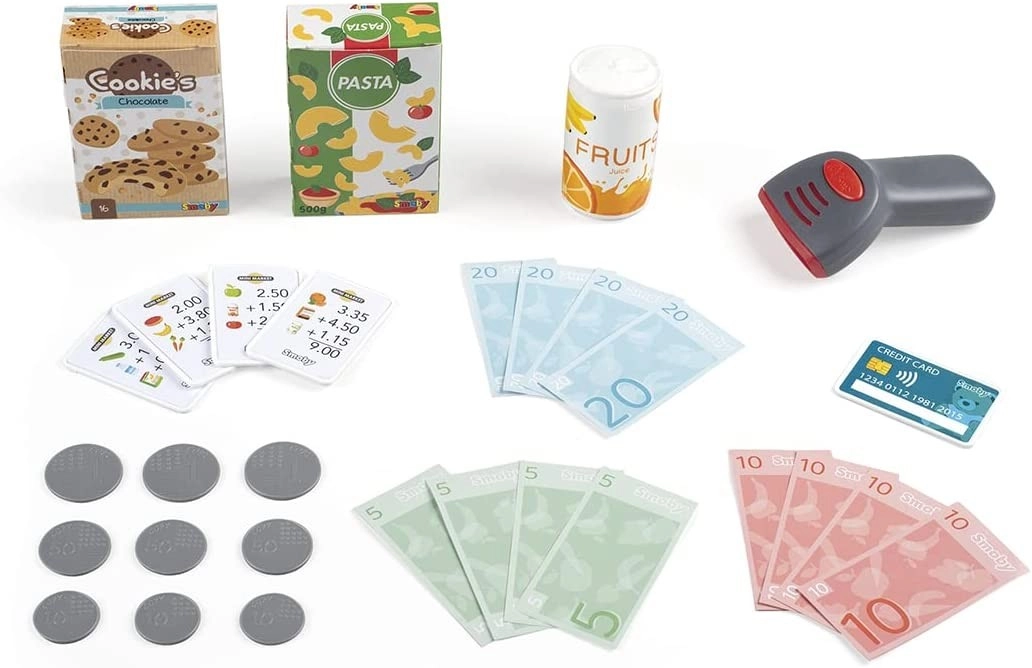 Vaikiškas elektroninis kasos aparatas SMOBY siūlo realistišką parduotuvės žaidimą su gausybe priedų. Vaikai gali svėrti produktus, nuskaityti juos skaitytuvu su šviesa ir garsu bei atsiskaityti monetomis, banknotais arba kortele. Rinkinyje yra tikras LCD skaičiuotuvas, atidaromas pinigų stalčius ir 30 vnt. priedų nesibaigiančiam smagumui ir mokymuisi.