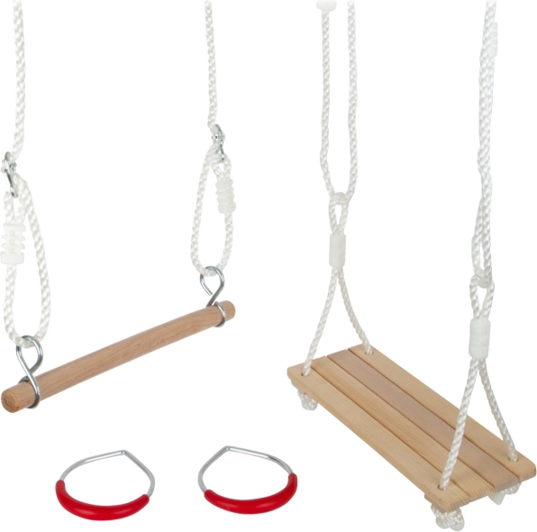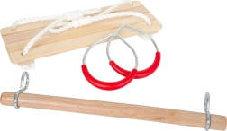 Šis daugiafunkcis rinkinys mažiesiems akrobatams suteikia aktyvaus judėjimo ir džiaugsmo tiek sode, tiek vaikų kambaryje. Klasikinės medinės supynės, kabančioji skersinė ir gimnastikos žiedai su patogiomis plastikinėmis rankenomis padeda lavinti koordinaciją, jėgą ir pusiausvyrą.