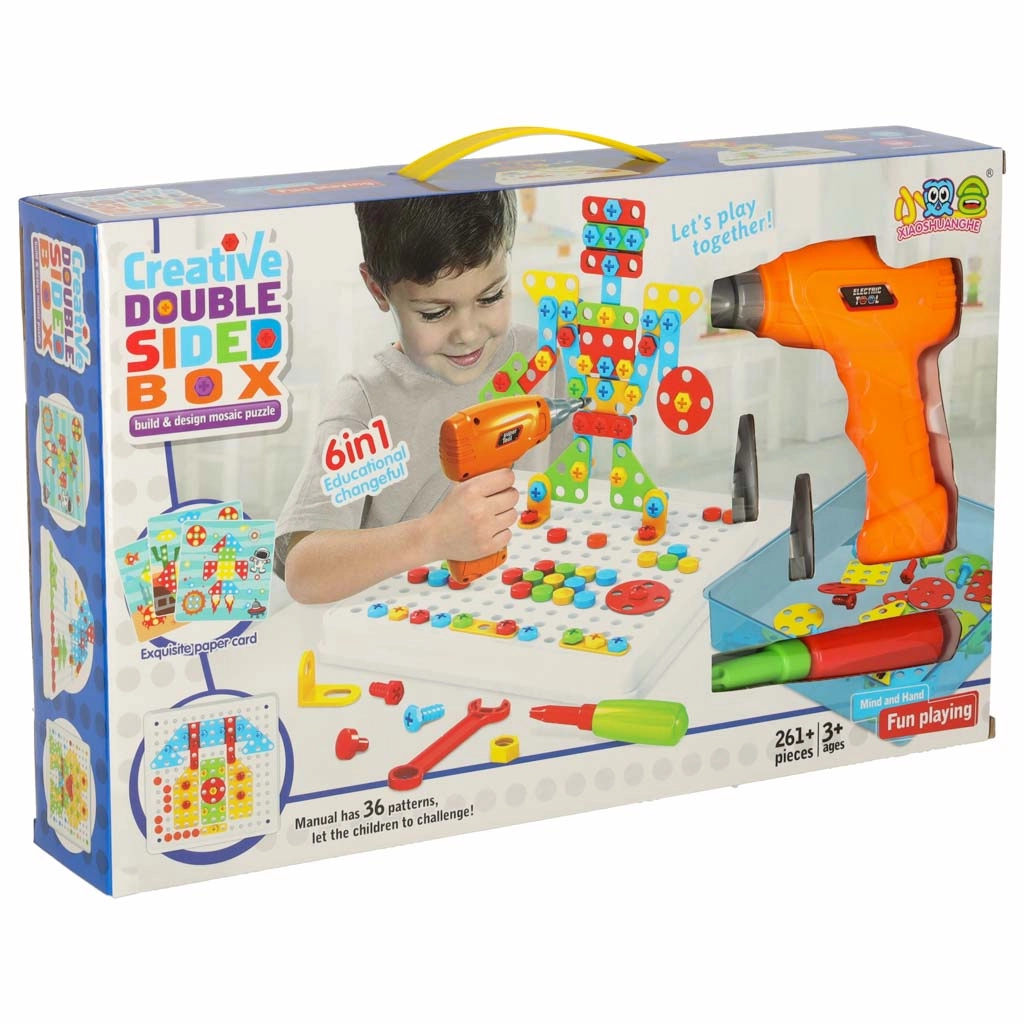 Linksmas edukacinis konstruktorius mažiesiems meistrams su elektriniu žaisliniu gręžtuvu, varžteliais ir mozaikine lentele. Vaikai lavins smulkiąją motoriką, kūrybiškumą ir techninį mąstymą dėliodami spalvotus raštus ir kurdami savo konstrukcijas. Patogus lagaminėlis palengvina nešiojimą, o gausi 261 dalių komplektacija užtikrina valandas puikaus žaidimo.